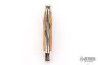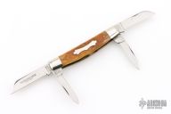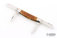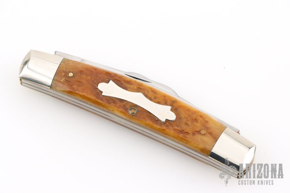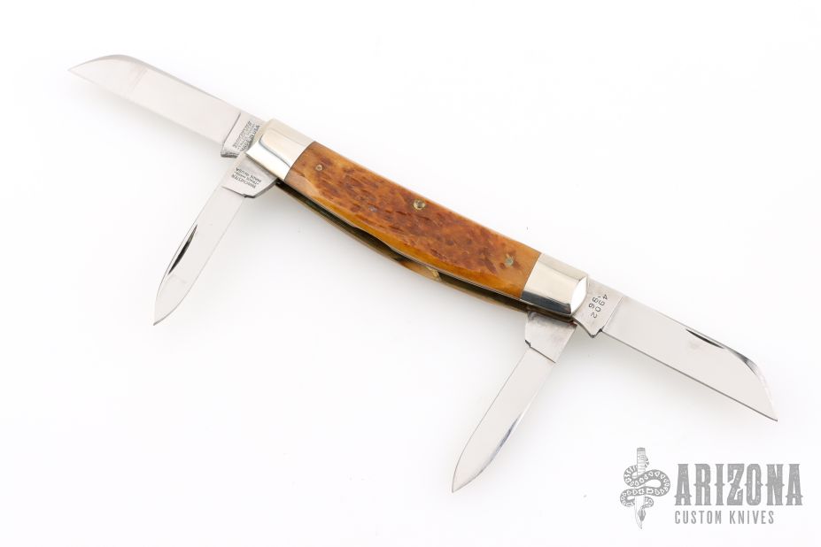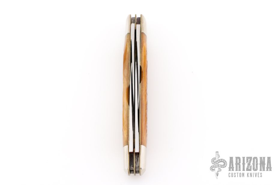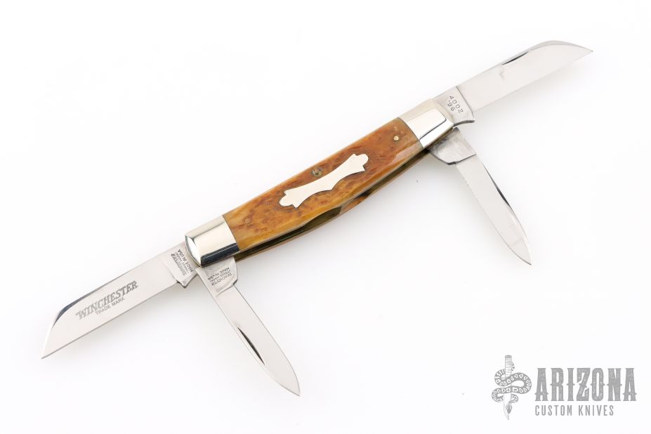 This Winchester folder features four mirror polished blades. Nickel Silver front and rear bolsters with light brown/yellow jigged bone covers. Brass liners and steel spring. Original box. Excellent condition.