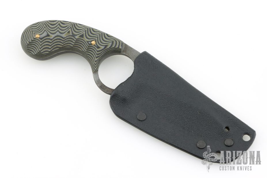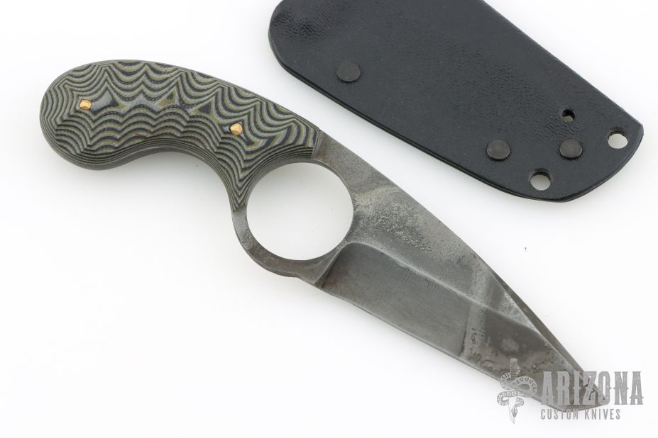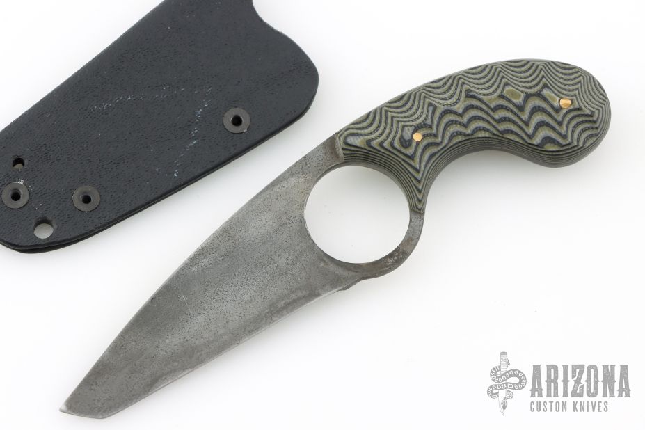 This custom tanto La Griffe by Fred Perrin features a tanto chisel ground blade with hamon, .122" blade stock and 1.240" blade depth, full tang construction. The handle has black/green/grey G-10 scales with brass pins. Comes with a kydex sheath. New from maker.