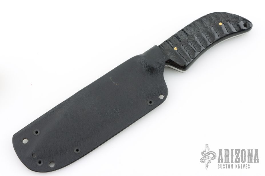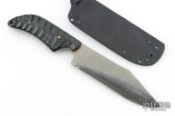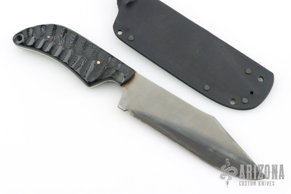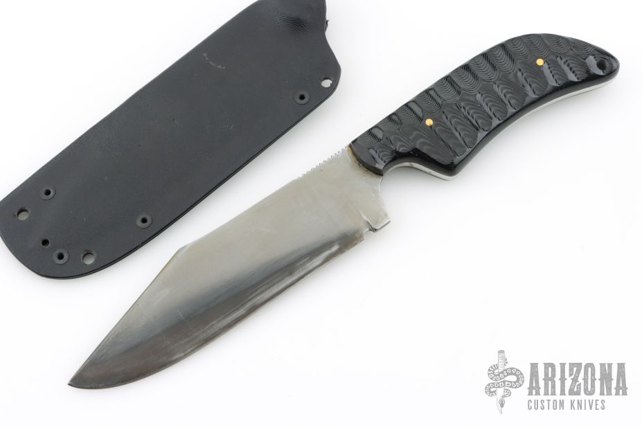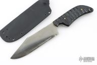 This Custom War Bowie by Fred Perrin features a clip point blade with swedge and notched thumbrest, has hamon, .156" blade stock and 1.595" blade depth, full tang construction. The handle has textured black linen micarta scales with brass pins and lanyard hole. Includes kydex sheath. Has some sheath scratches, otherwise excellent condition.