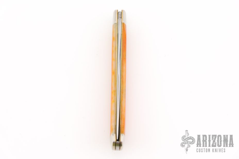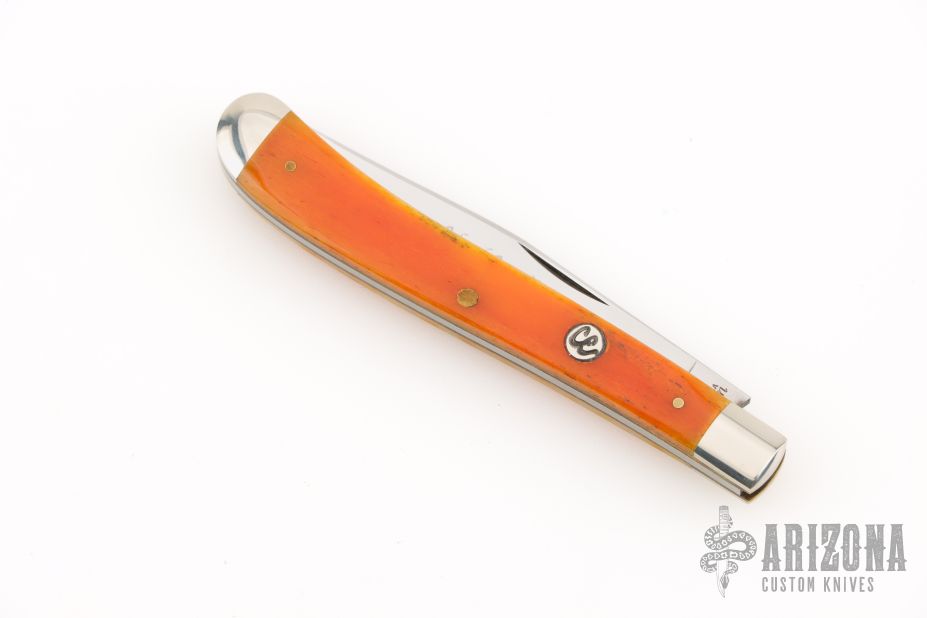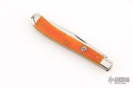 This Slimline Trapper by Colonel Coon features a mirror finished blade with nail nick. The handle has nickel silver bolsters, orange bone scales, brass liners, stainless steel springs. Comes with original box. Excellent condition.