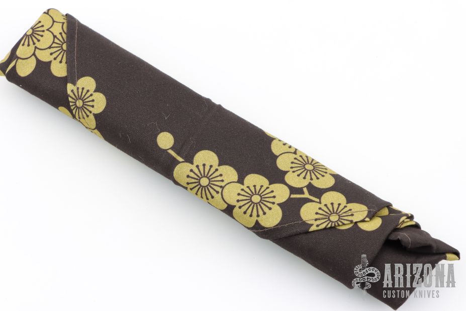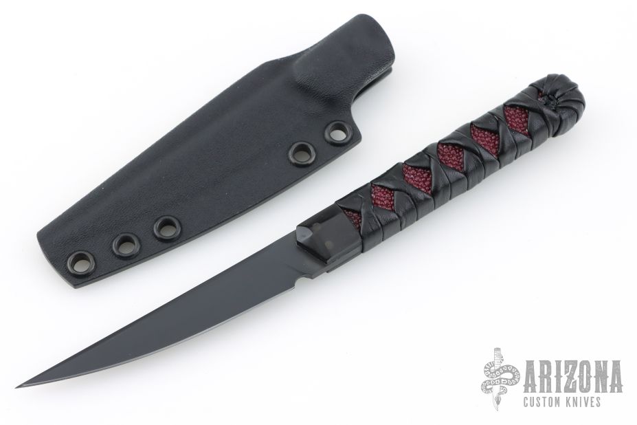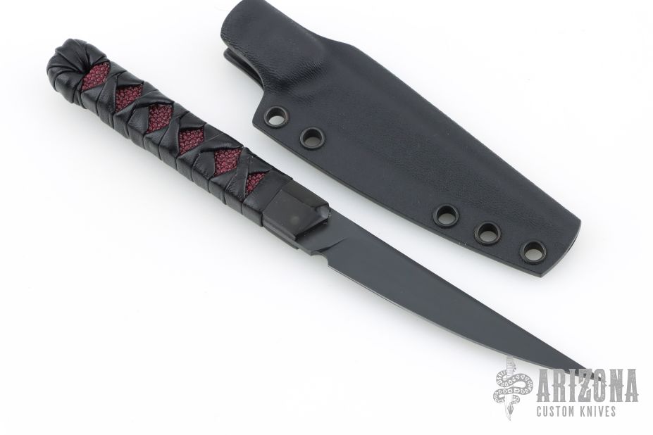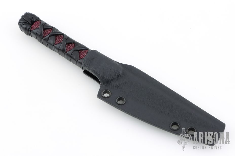This is paired with a handle constructed on a black G-10 liner, and polished buffalo horn fittings. Crimson lacquered Samegawa (stingray skin) is underneath the black leather tsukaito.