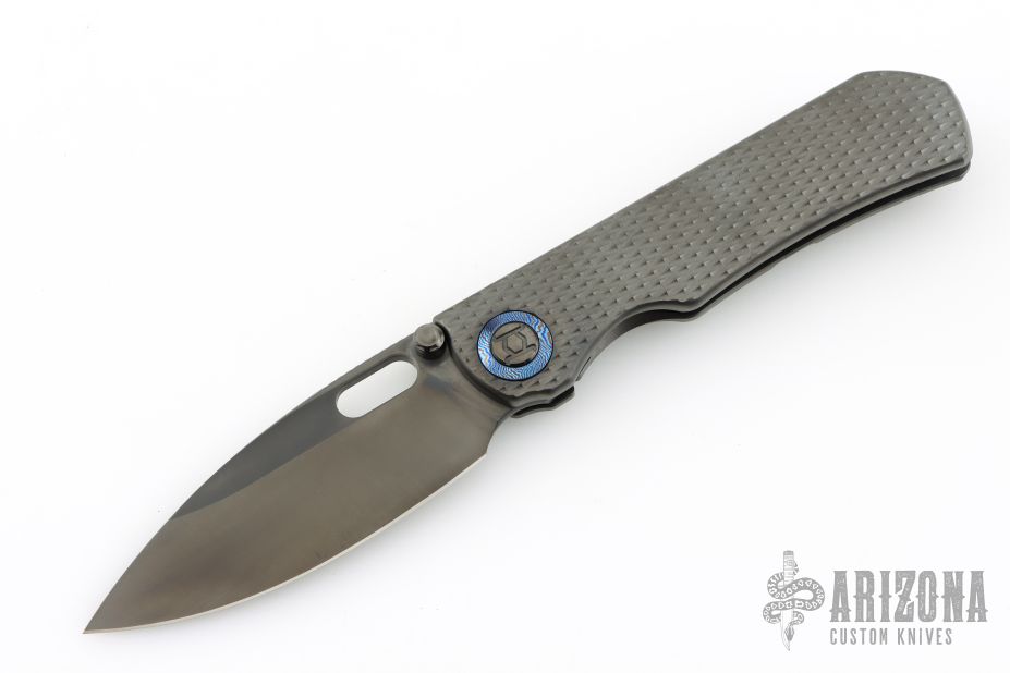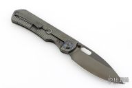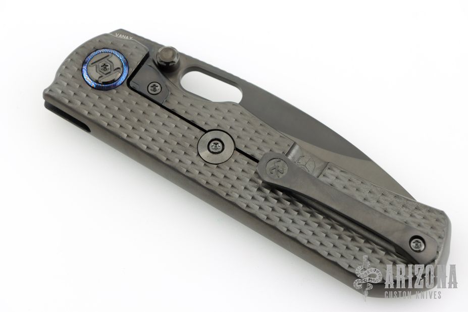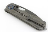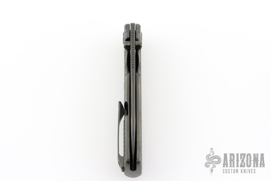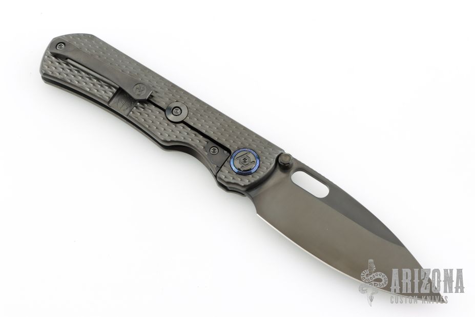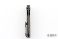 This knife by Kunwu Knives features a black satin finished blade with notched thumbrest and flipper. The handle has a black textured titanium integral frame, mokuti pivot collar and black titanium tip up clip. Comes with original box and extra hardware. Vanex blade steel. Excellent condition.