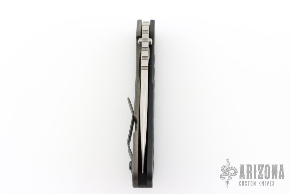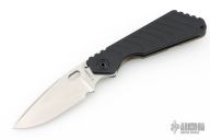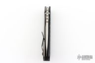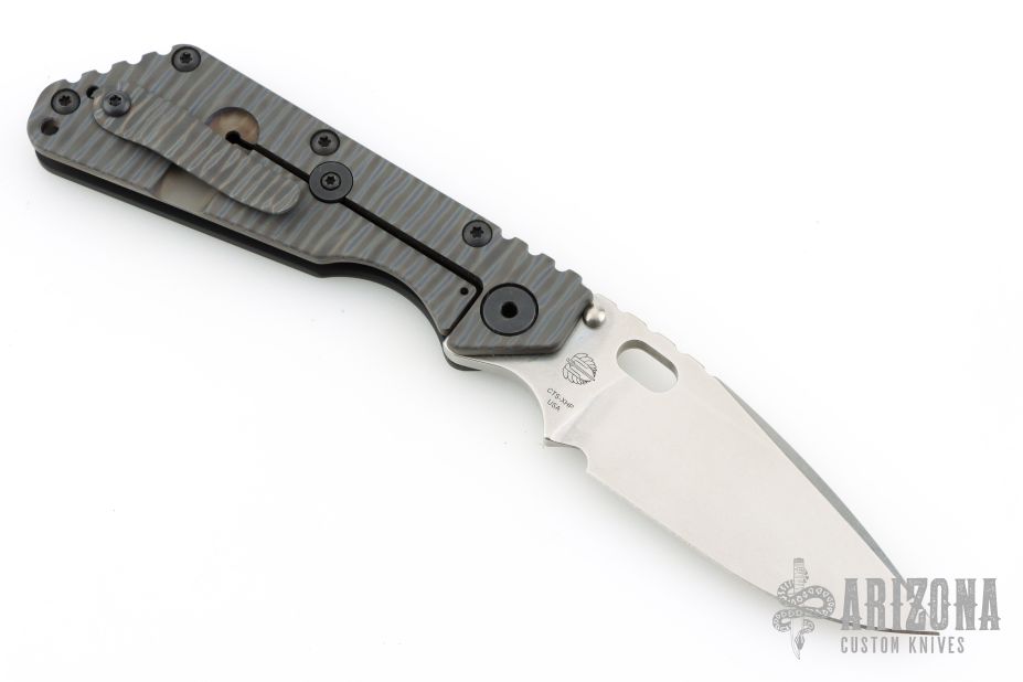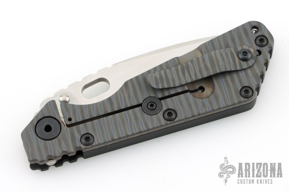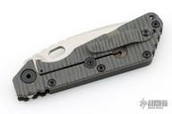 This Mick Strider SMF framelock folder features a stonewashed blade with thumbhole and notched thumbrest. The handle has a black aluminum and flamed titanium frame with titanium clip. Jimping on blade spine. Nice lockup, detent, and blade seating. Excellent condition.