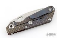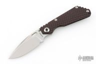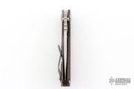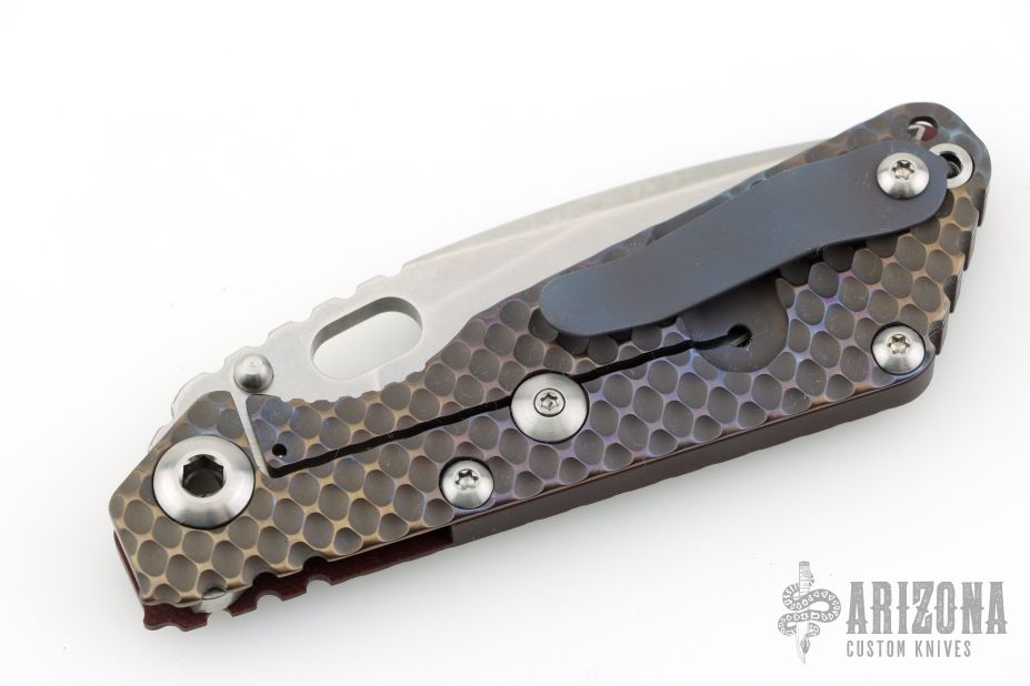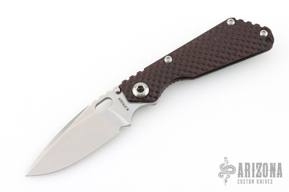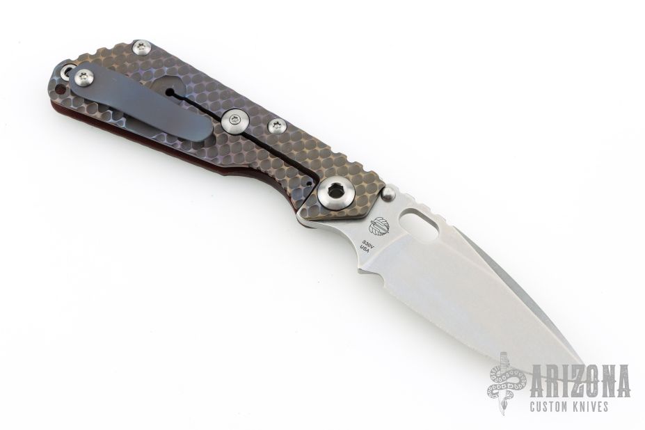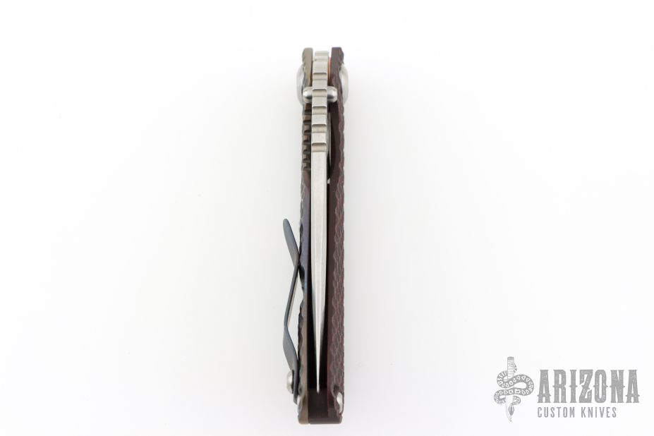 This SNG DGG by Strider has a stonewashed finished blade with dual thumb studs, thumb hole, and notched thumb rest. Handle is Black Cherry G-10 and bead blast and anodized titanium "Gunner Grip", lockbar stabilizer, and titanium tip up clip. Nice detent, lockup and blade seating. New condition.