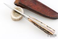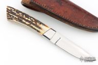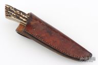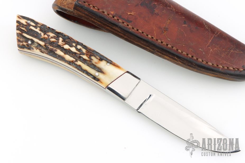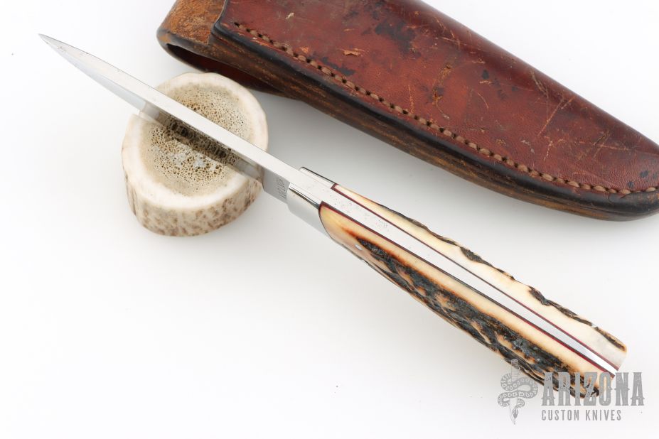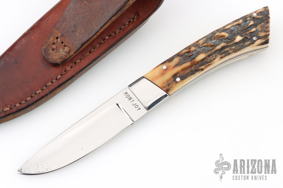 This drop point hunter by Claude Montjoy features a mirror finished blade with a tapered tang construction. .179" Blade Stock. .910" Blade Depth. The handle features stainless steel bolsters with stag scales over red liners. Includes a brown leather belt sheath. Has scuffs, scratches, and patina. Good condition otherwise.