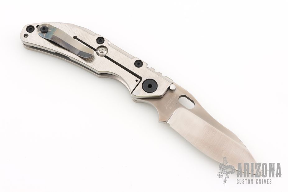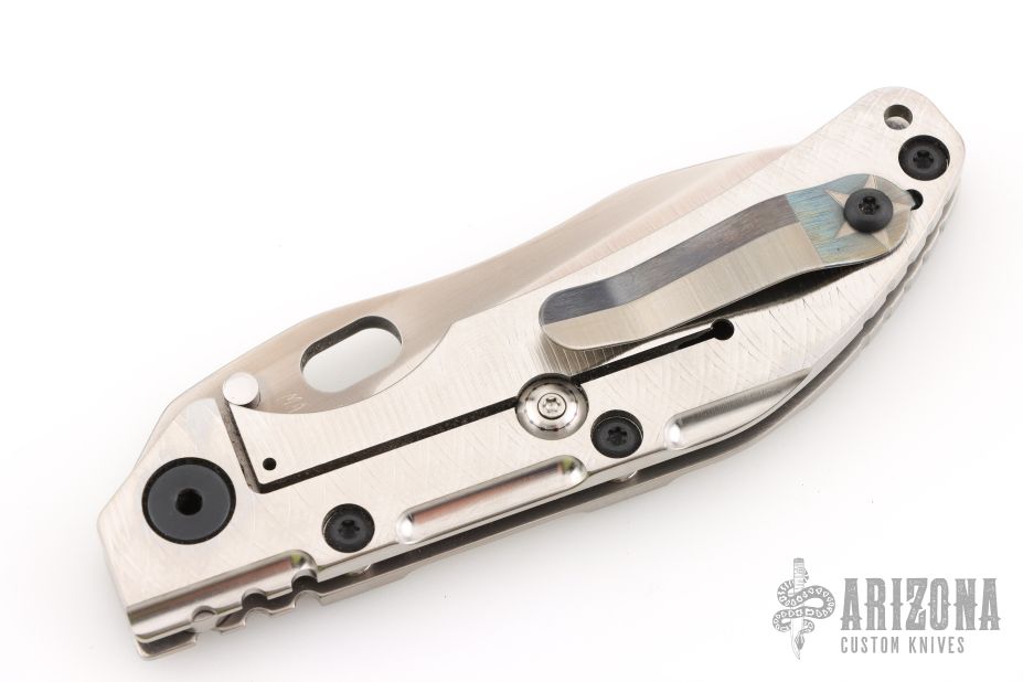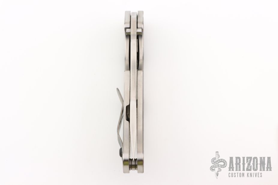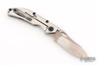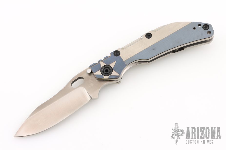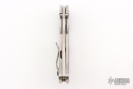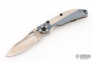 This DCG BBNL Framelock Folder has a satin finished drop point blade with dual thumbstuds and thumbhole. Handle has a Flag finished titanium frame and tip up clip, and titanium barrel spacers, black hardware. Centered blade and great lockup and detent with zero blade play. Excellent condition.