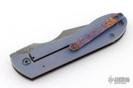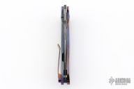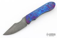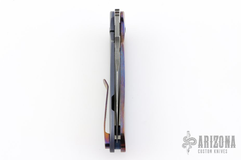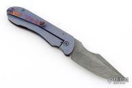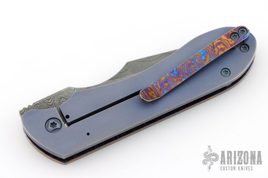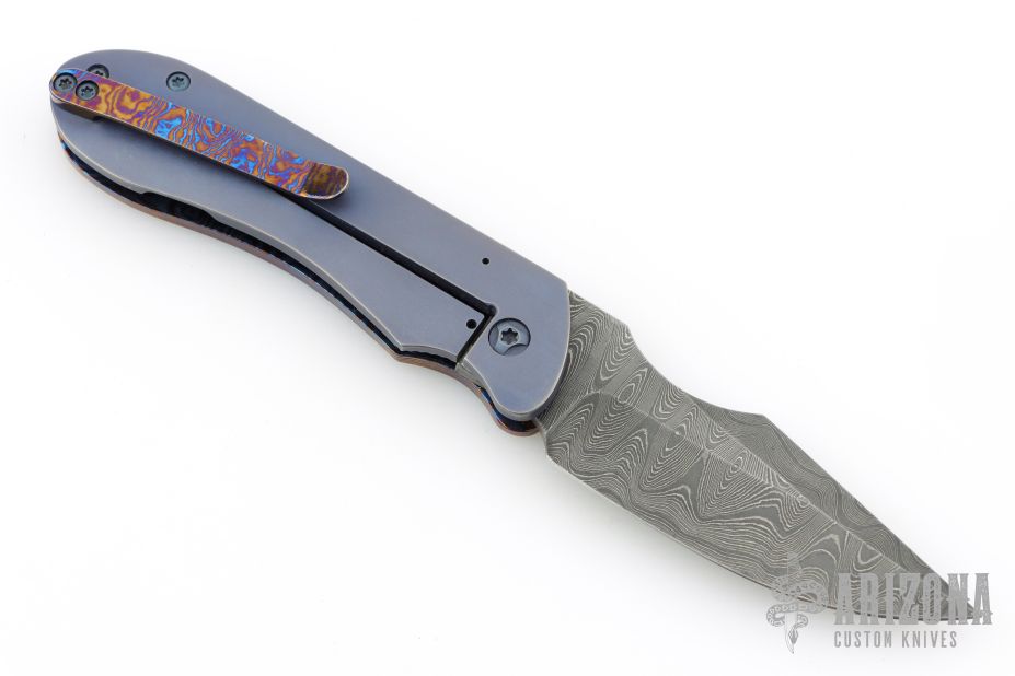 This Framelock Front Flipper by Maverick Custom Knives features a Damascus blade with false top edge and notched front flipper. The handle has a MokuTi and anodized titanium frame, MokuTi tip up clip.  Has some light scuffs, excellent condition otherwise.