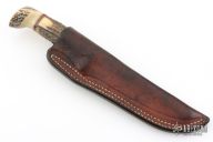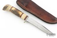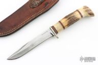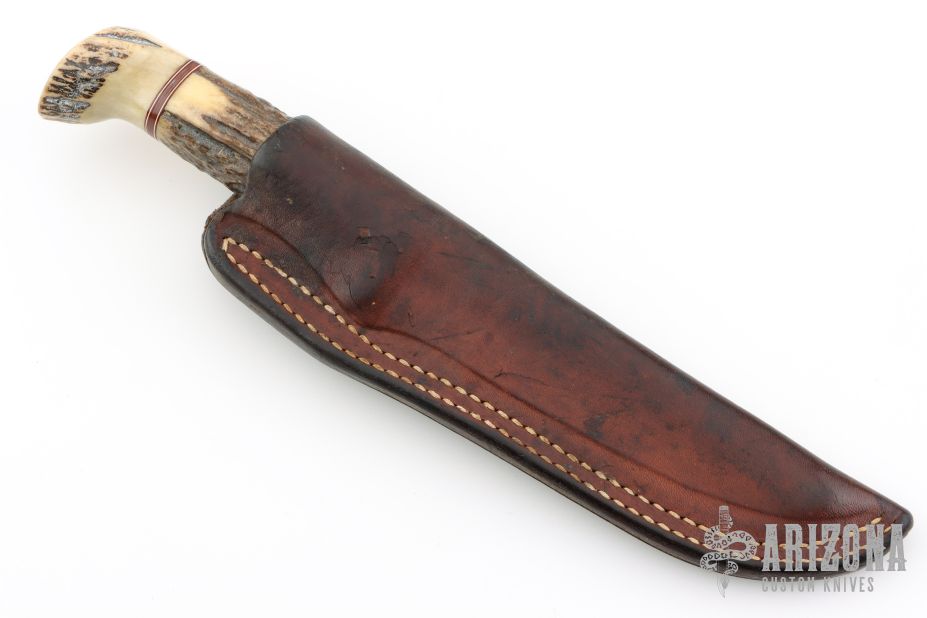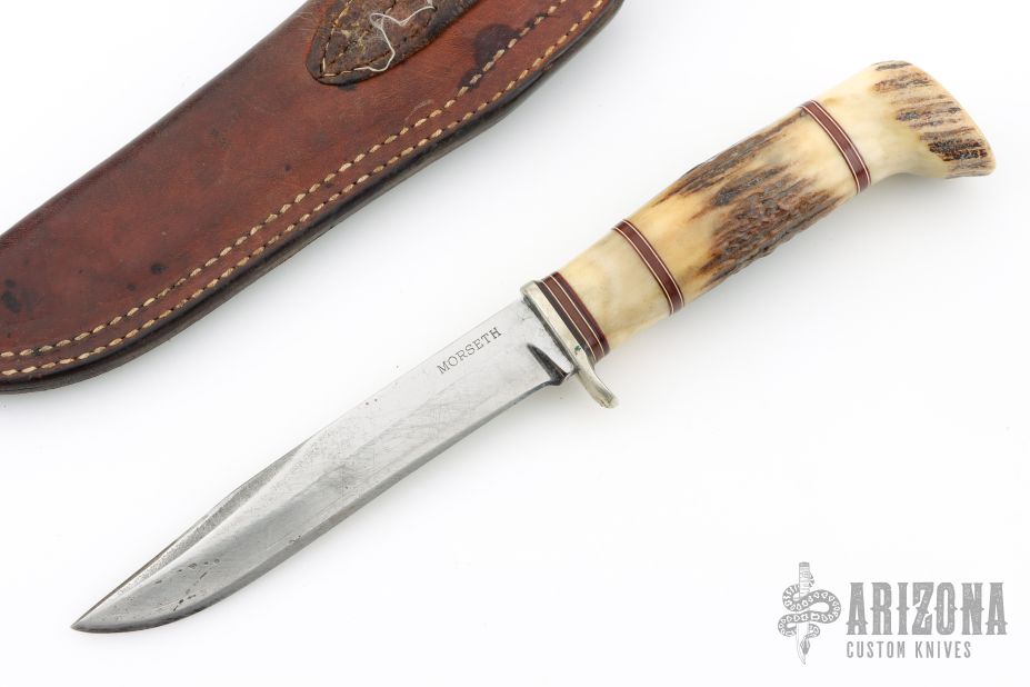 This Morseth Stag hunter has a satin finished clip point blade with hidden tang, .190" blade stock and .884" blade depth. Handle is stag antler with a nickel silver guard, black, white and red spacers. Comes with a brown leather belt sheath. Has scuffs, scratches, and patina. Good condition for its age and otherwise.