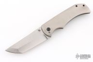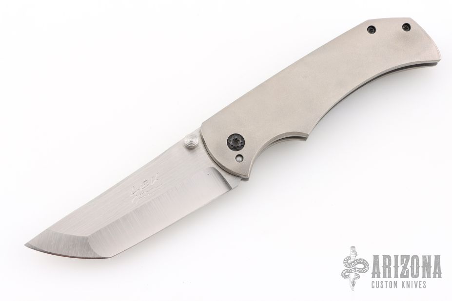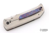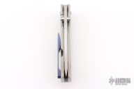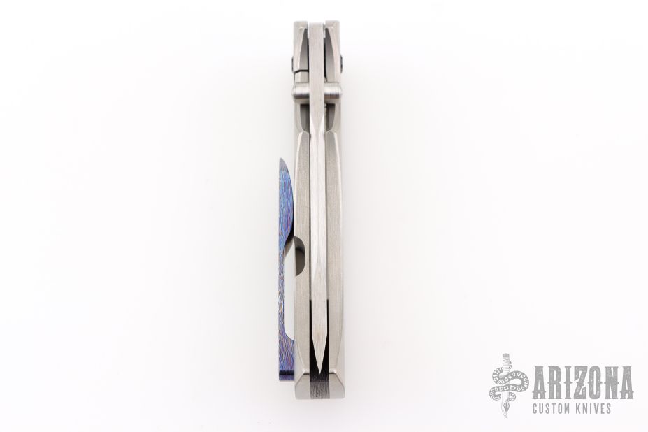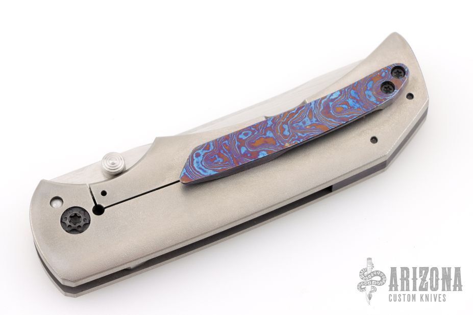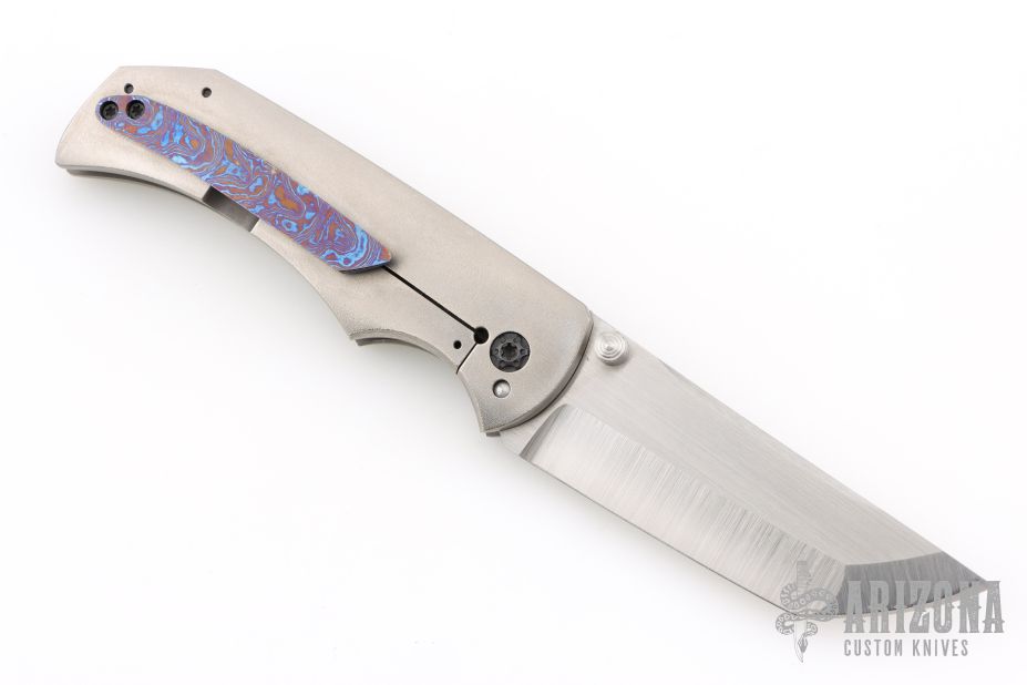 This Unnamed Model by Pohan Leu is one of the first 12, this is designated by the double squiggles under his makers mark. It features a satin finished hollow ground blade with flat ground tip, dual thumbstuds. The handle has an orange peel finished and titanium frame and timascus tip up clip, carbon fiber backspacer. Nice detent, lockup and blade seating. Comes with a hard case. Excellent condition.