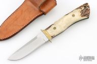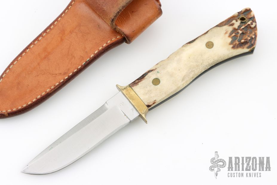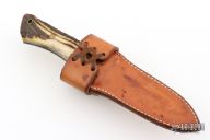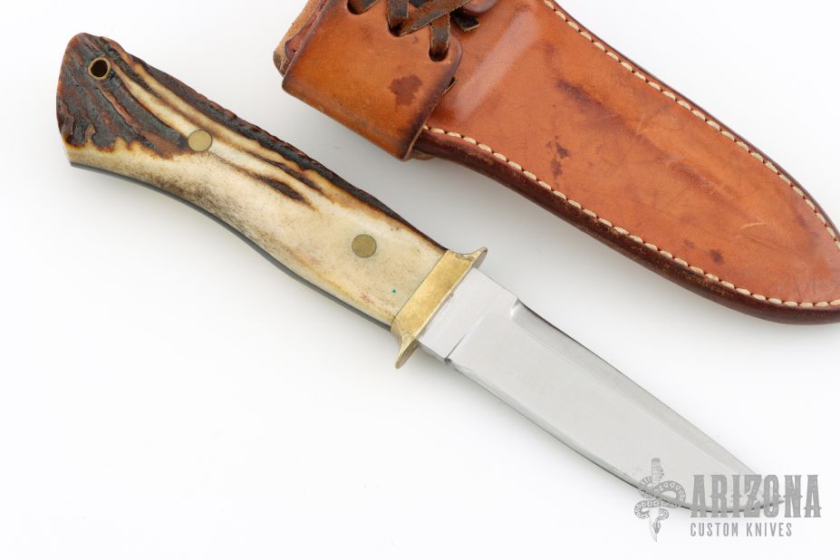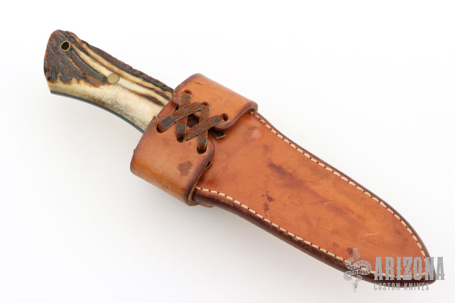 This AD880 by Benchmark Knives features a satin finished blade with false top edge, .177" blade stock and 1.040" blade depth, "half" tang construction. The top part of the blade spine is exposed, but there is a layer of black micarta (or Delrin) in the belly of the handle. The handle has a nickel silver guard, stag, thong hole. Comes with a brown leather belt sheath. Has scuffs, scratches, and patina. Has been resharpened. Good overall condition.