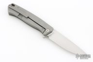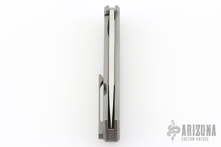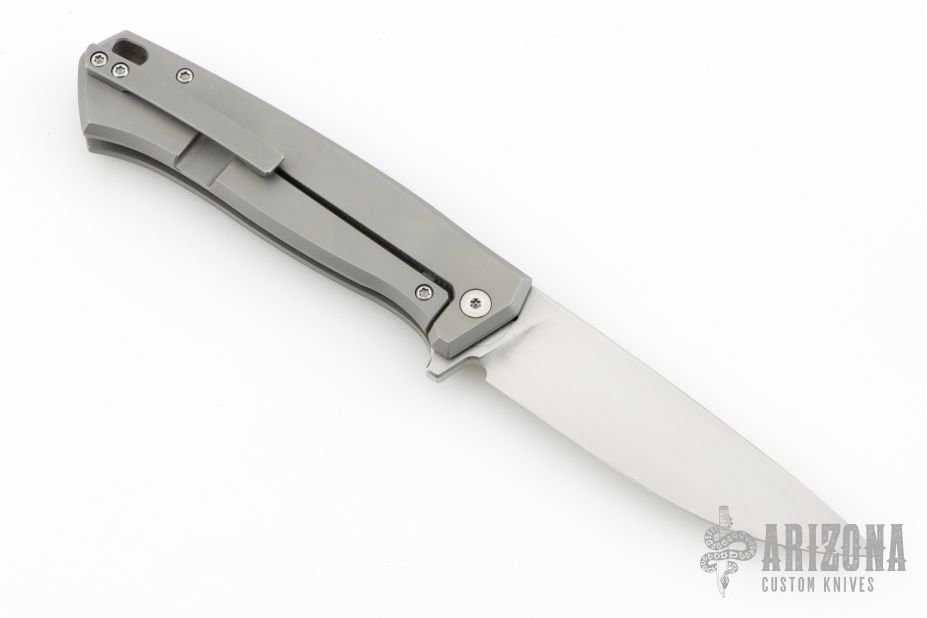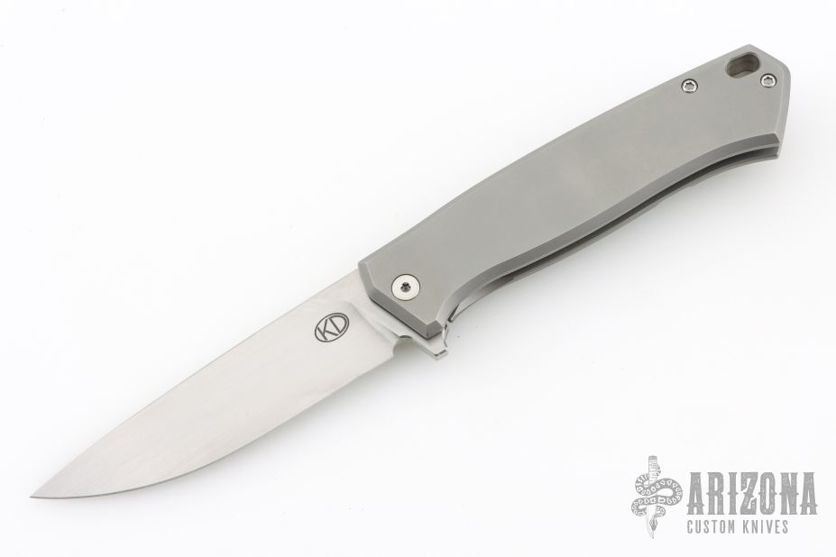This Arsen framelock flipper by KD Knives features a hand rub satin finished blade with a flipper. The handle has a bead blasted titanium frame with a matching backspacer and tip up clip. Rides on bearings, nice detent, lockup and blade seating. Has a couple light scuffs, otherwise excellent condition. Comes with a zippered case.