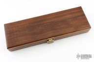 This Hunter by Wayne Hensley features a Damascus blade with false top edge, .117" blade stock and .702" blade depth, hidden tang construction. The handle has a mokume guard and a carved stag grip. Comes with a wooden display box. Excellent condition.