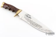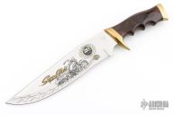 This custom mountain bowie by Buck Knives features a mirror finished clip point blade with .177" blade stock and 2.116" blade depth, hidden tang construction. The handle is comprised of a brass guard, dymondwood grip, and brass butt cap, black and brass spacers. Includes wooden display box and COA. Has a couple light scratches, otherwise excellent condition. #1799