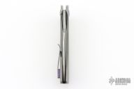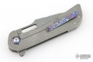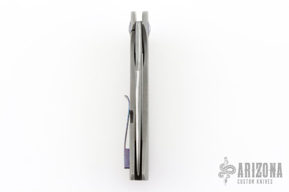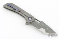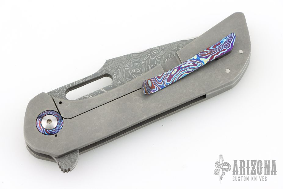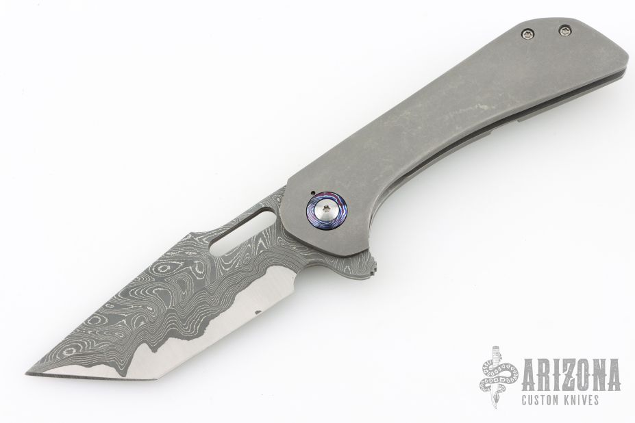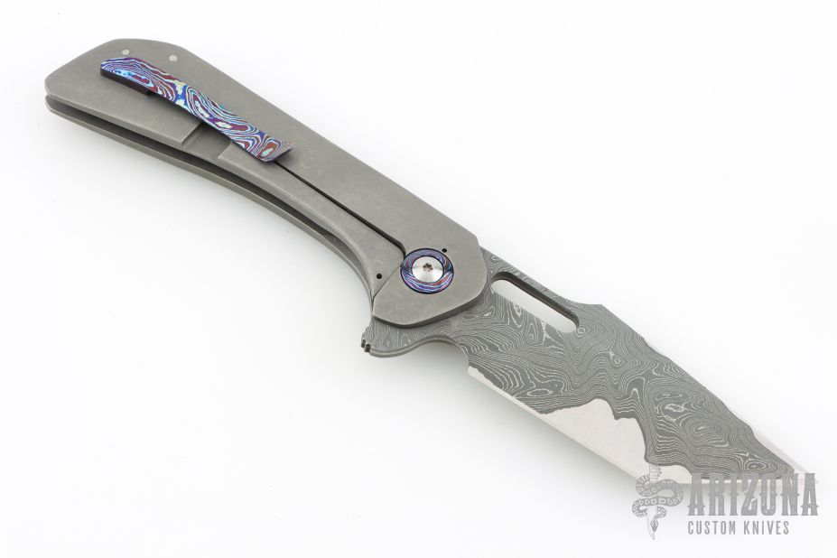 This knife by Nova Blades features a San Mai Damascus blade with false top edge, thumbhole, notched flipper. The handle has a stonewash finished titanium frame with a mokuti tip up clip with hidden screws, mokuti pivot collars, San Mai Damascus backspacer. Rides on bearings, nice detent, lockup and blade seating. Excellent condition.