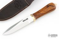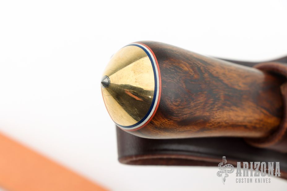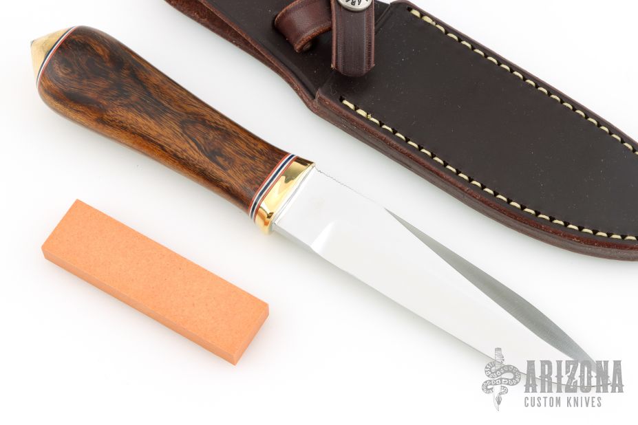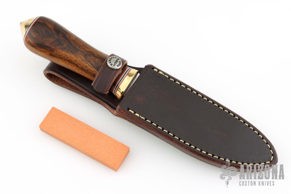 This Gambler by Randall Made Knives features a satin finished blade with .212" blade stock and 1.085" blade depth, hidden tang construction. Sharpened top edge. Notched thumbrest. Desert Ironwood grip with a brass guard and coolie cap butt, red/white/blue spacers. The Gambler is one of Randall's non-catalog knives. Comes with a waxed brown leather sheath and original paper wrapping. Excellent condition.