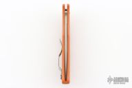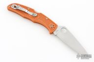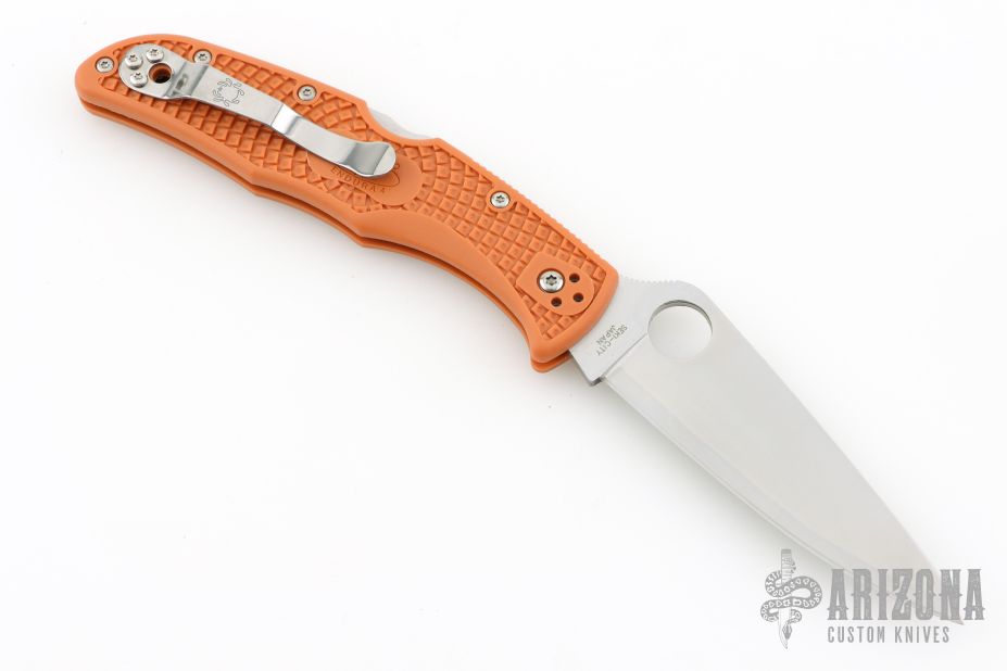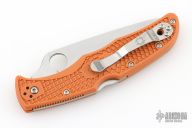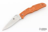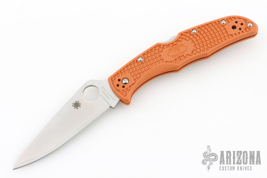 This Endura lock back folding knife by Spyderco features a satin finished blade, HAP40/SUS410 San Mai, thumbhole and notched thumbrest. The handle has burnt orange FRN scales with stainless steel backspacer and 4-way reversible stainless steel clip. Include original box and papers. Has a couple light scuffs. Excellent condition.
