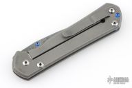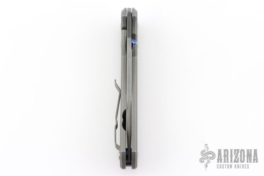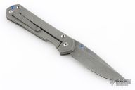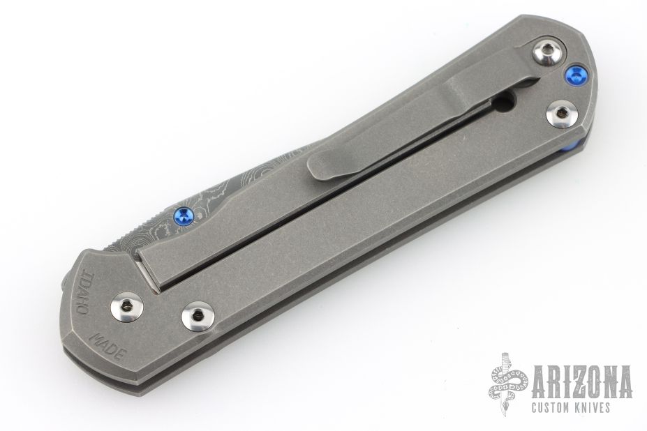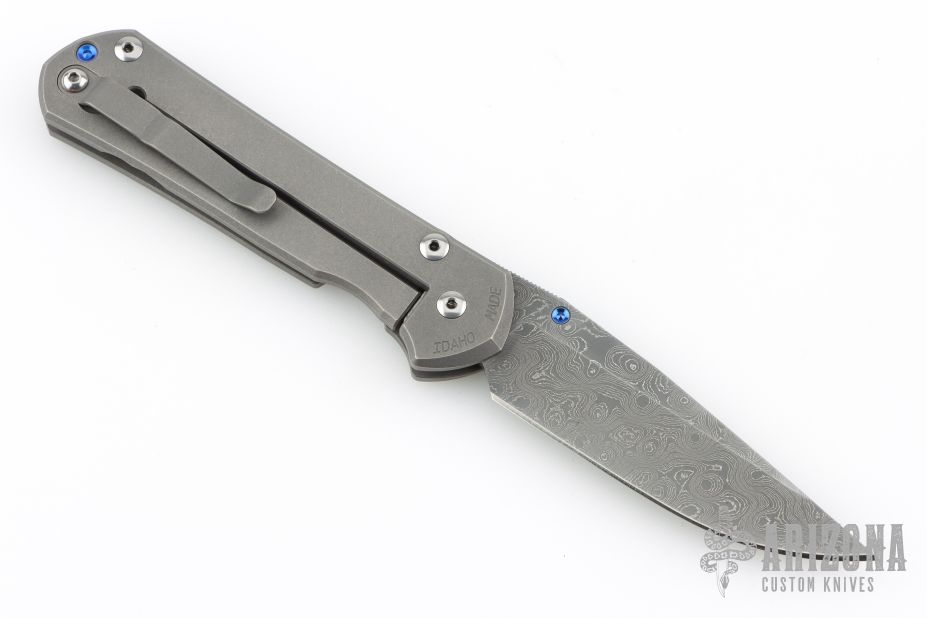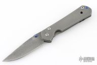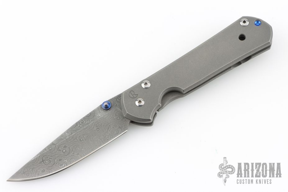 This Large Sebenza 21 by Chris Reeve features a Chad Nichols "Raindrop" pattern stainless Damascus blade with single anodized thumbstud. The frame is tumbled titanium with matching tip up clip. Nice detent, lockup and blade seating. Comes with original box, cloth, lube and tools. Marked D-18 on the inside of the slabs. Has some scuffs and scratches, and some wear on the ano. Great overall shape and condition.