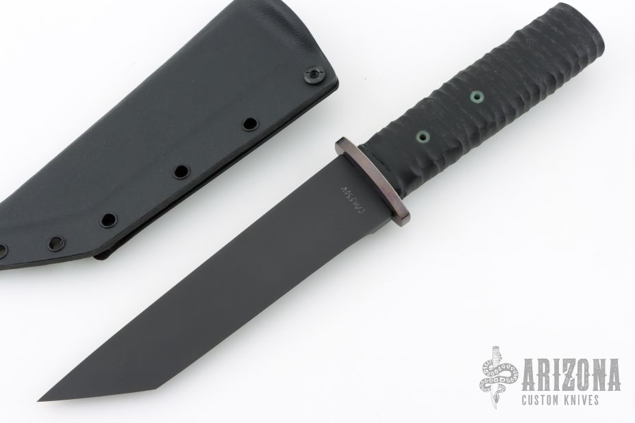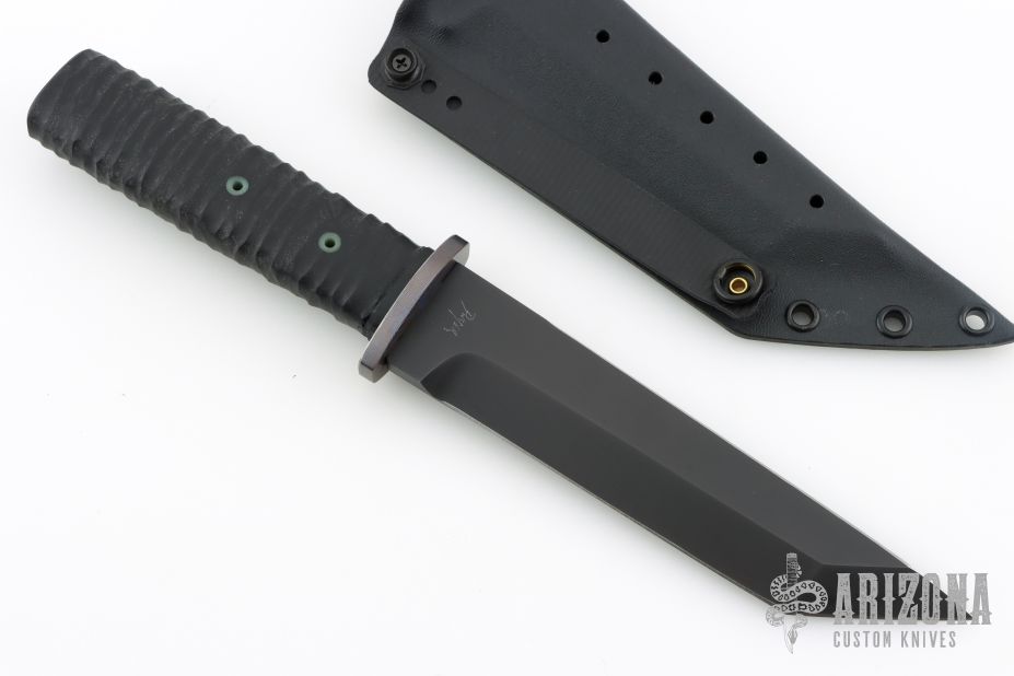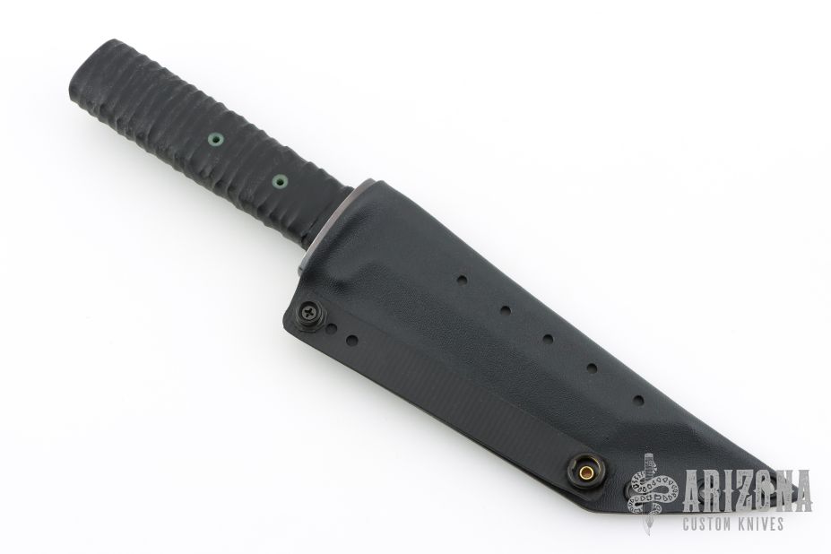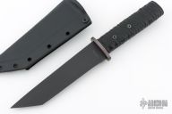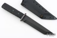 This Tanto Fighter by Duane Dwyer features a chisel ground black blade with .254" blade stock and 1.47" blade depth, full tang construction. The handle has a MokuTi guard, textured G10 scales. Comes with a kydex sheath. Has a couple light scuffs, Excellent condition.
