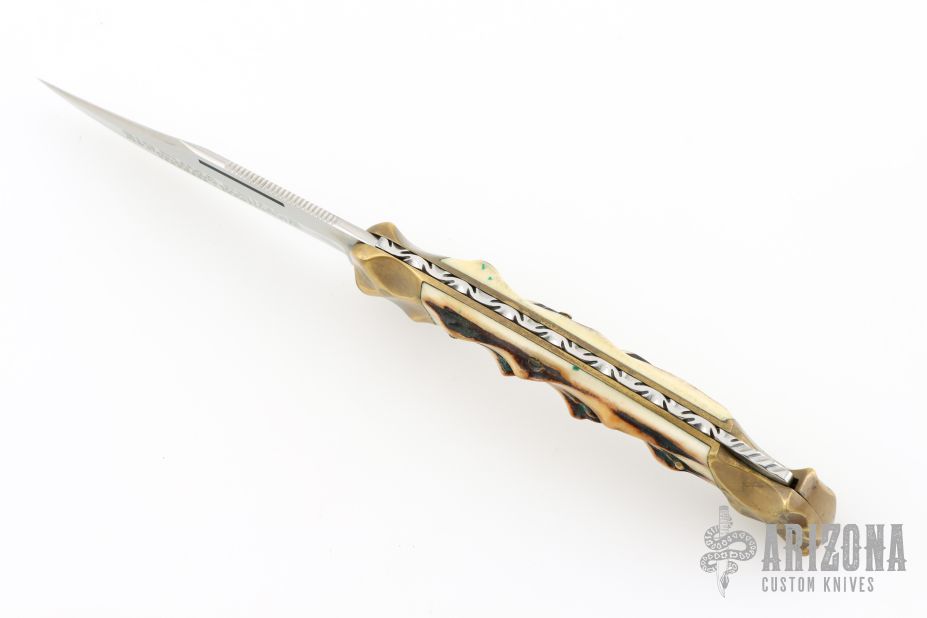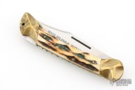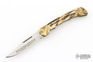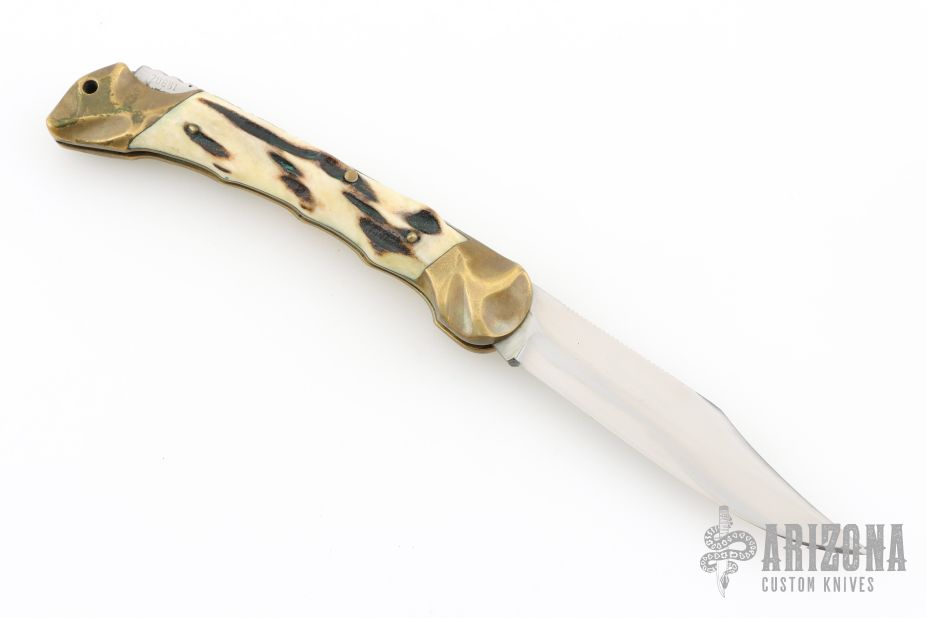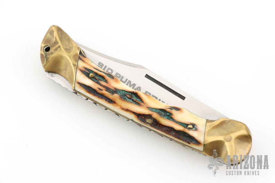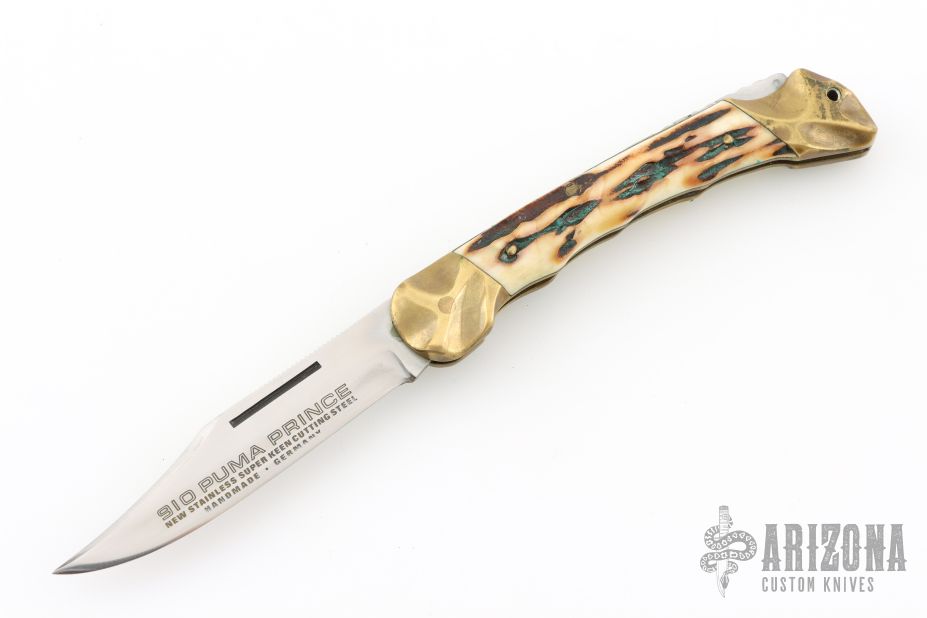 This Puma Prince lockback has a satin finished black with nail nick and notched thumbrest. The handle has a carved brass frame with stag inlays, fileworked stainless steel backspacer, lanyard hole at the butt. Has some light scratches and patina, otherwise excellent condition. Comes with a leather slip sheath. #20681