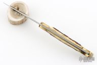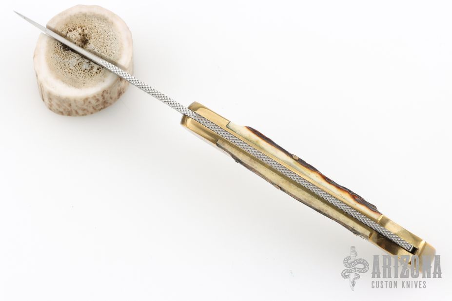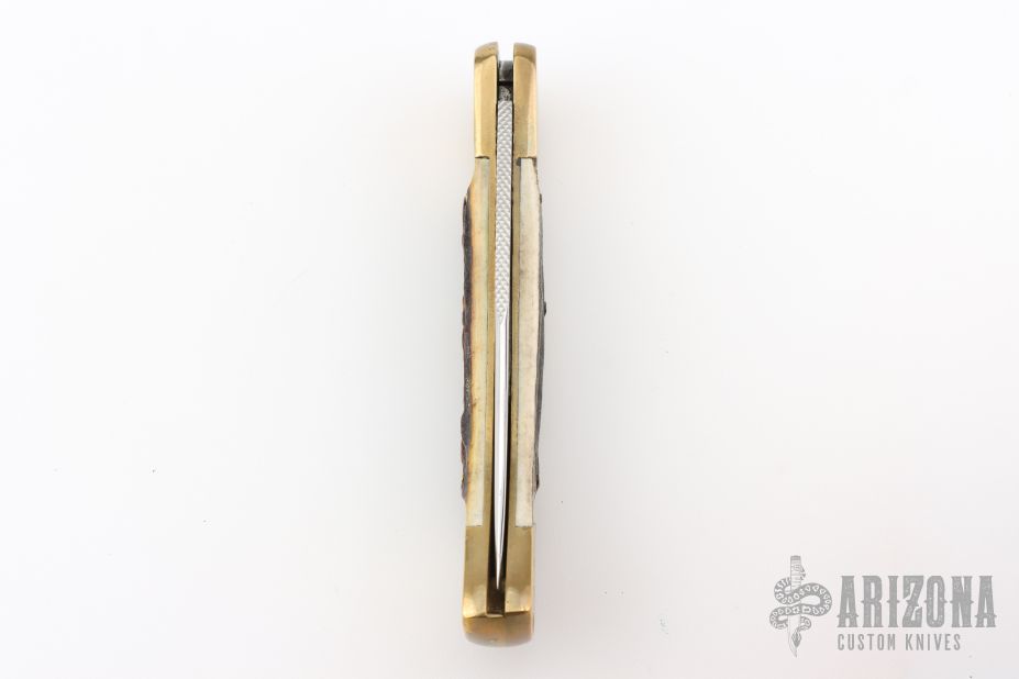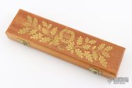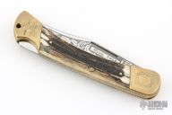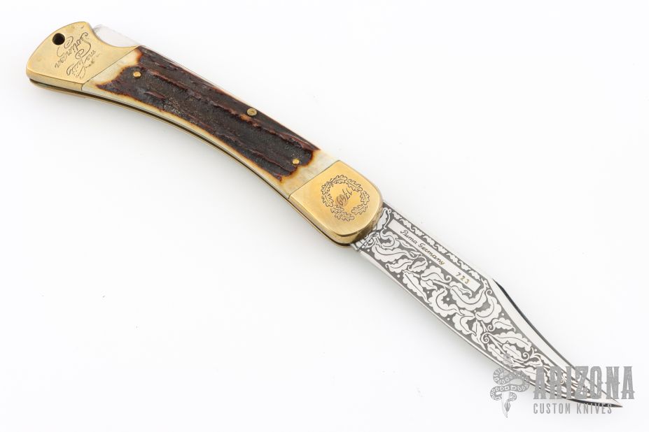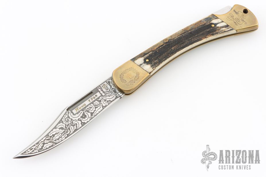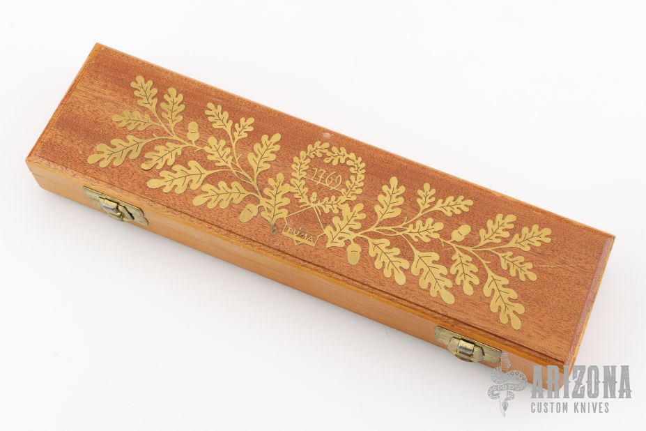 Puma Solingen Germany 1769 Anno 200th Anniversary Gold Filled Etch Large Lockback Knife in Wood Box c.1969 - 1 of 1769 Made - Serial # 723 - Genuine Stag Handles - Engraved Brass Bolsters - Brass Liners - Locks up Tight - No Wobble - Unused and Unsharpened - Very Nice Unused Condition in the Original Wooden Presentation Box.  Excellent Condition.