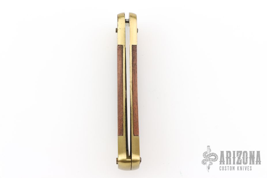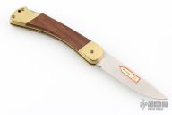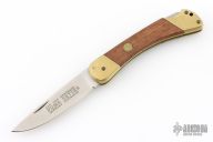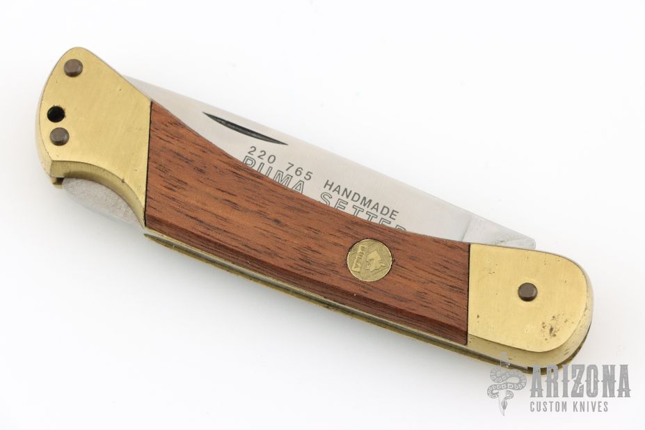 This Setter Lockback by Puma Knives features a satin finished blade with nail nick. The handle has brass bolsters with integral liners, wood scales with a brass escutcheon, stainless steel backspacer. Has some patina, excellent condition otherwise.
