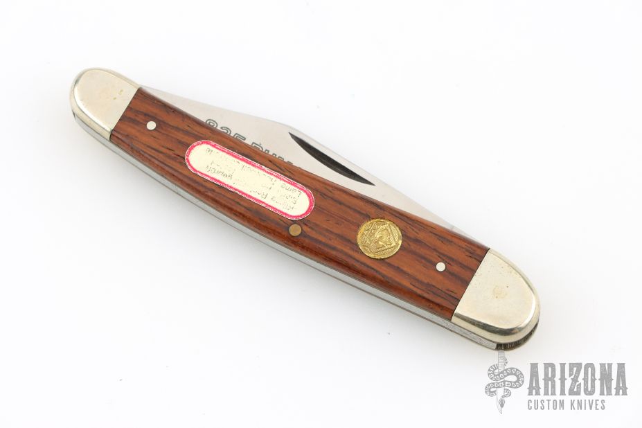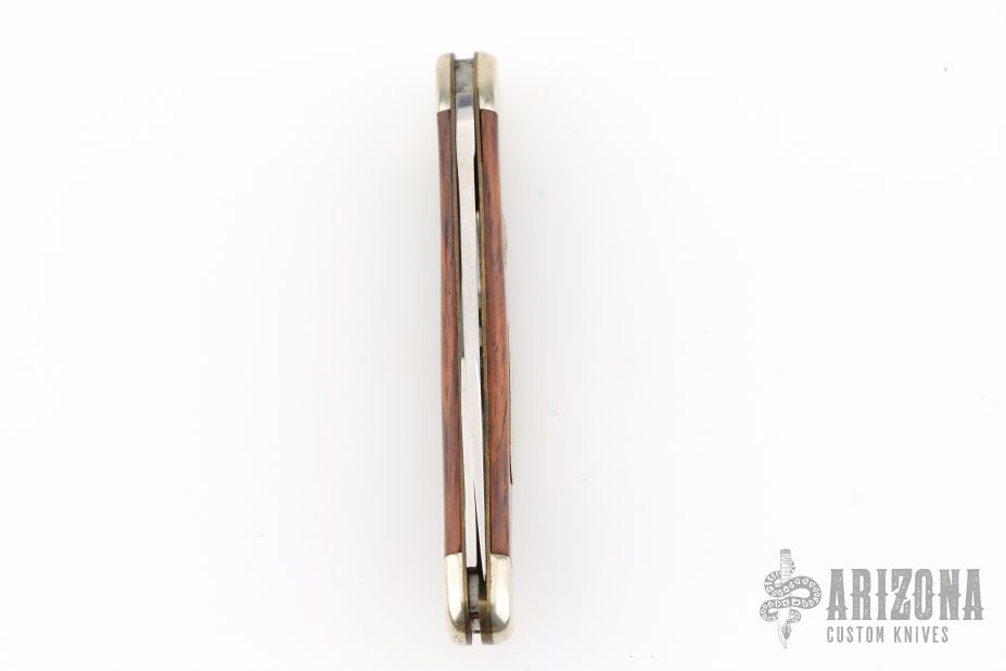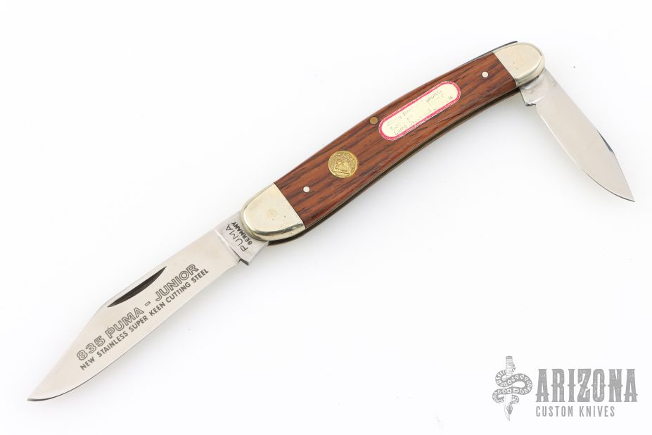 This 835 Junior Slipjoint by Puma Knives features satin finished blades with nail nicks. The handle has nickel silver bolsters, cocobolo covers, brass liners and stainless steel spring. Has some light scratches, otherwise good condition.