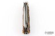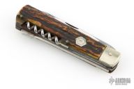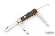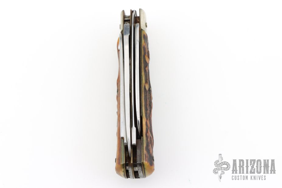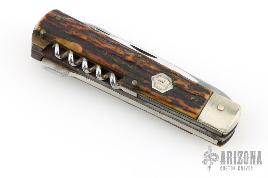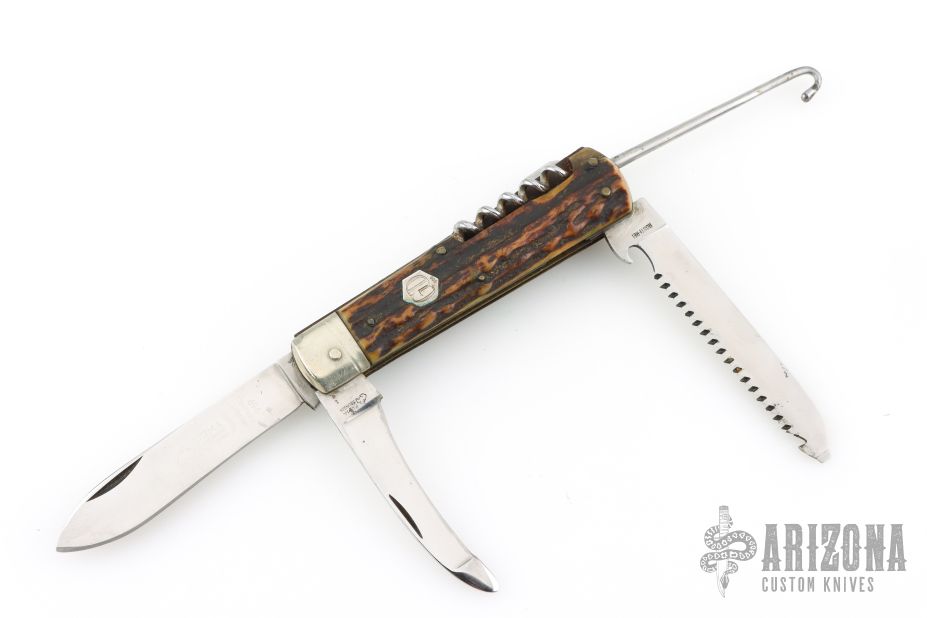 This legendary knife features satin finished stainless steel (Rostfrei) blades. The handle has nickel silver bolsters, stag scales, brass liners and stainless steel springs. Has brass hexagon inlay stamped "008" or "800" not sure which is correct. Main blade is a lockback. Has a drop point blade, a hawkbill blade with rounded tip, saw blade with bottle opener, gut/carry hook. Has scratches, has been used and sharpened, has patina and oxidation on the springs, fair condition.