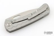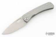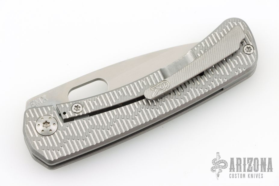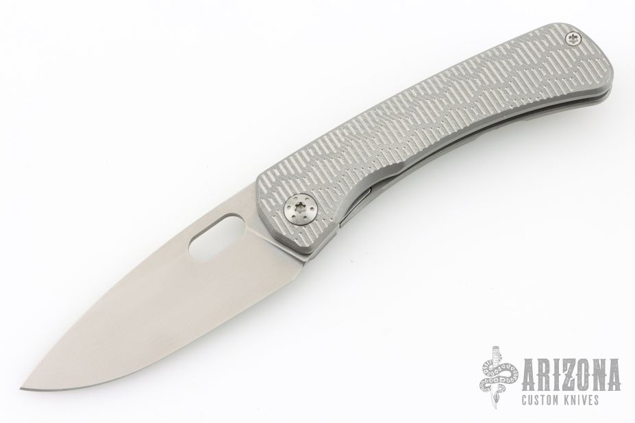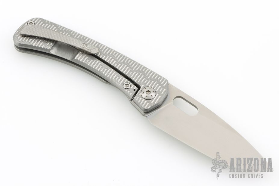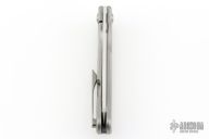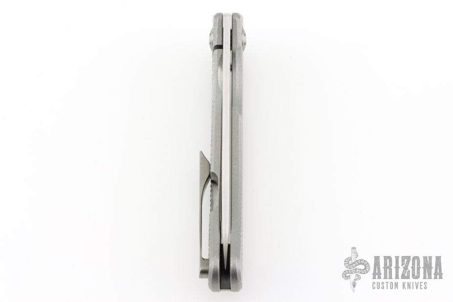 This Lamia by SPK Unlimited features a milled stonewashed blade with thumbhole. The handle has a milled titanium frame with matching hardware, backspacer and tip up clip with hidden screws. Comes with original box. Excellent condition.