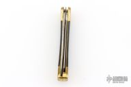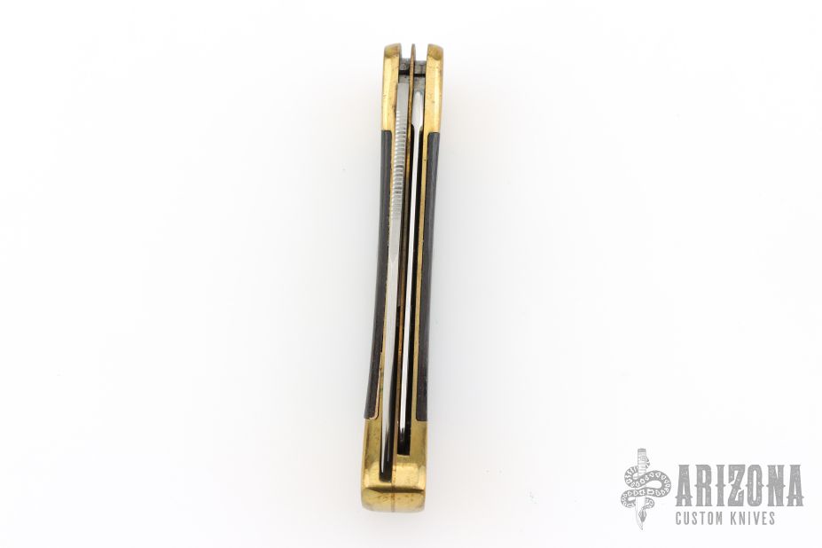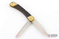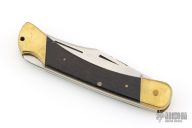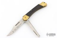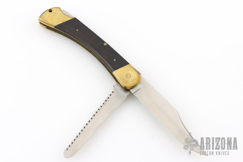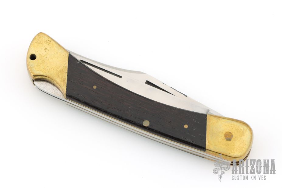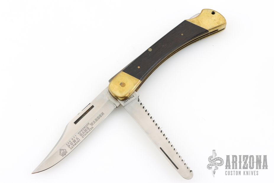 This Puma Game Warden lockback has a brass frame with wood scales. The blades are satin finished with nail nicks. One of the blades is a saw. Has some light scratches, and some patina, otherwise excellent condition.