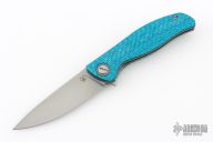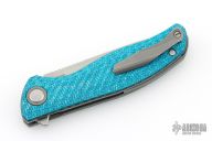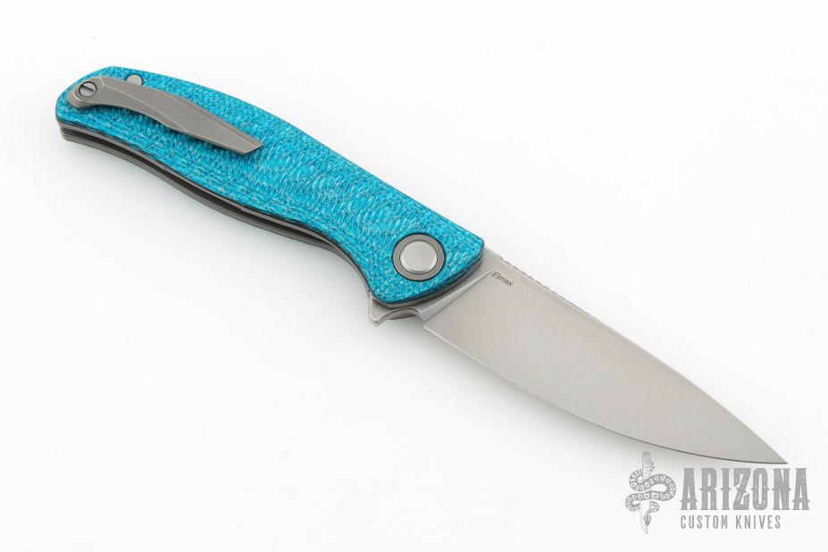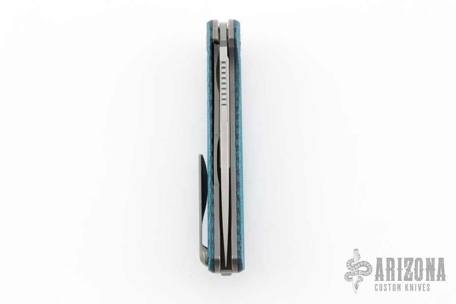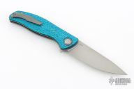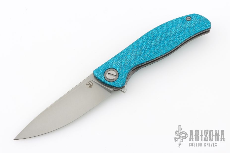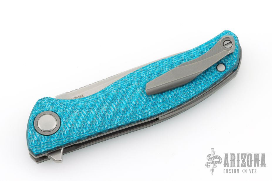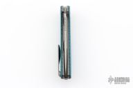 This F3 Flipper from Shirogorov has a tumbled flat ground spear point blade with notched flipper. Handle has AQ Alutex scales, tumbled titanium backspacer, tip up clip and liners. Recessed lanyard bail. Dead center blade seating, excellent detent and lockup. Rides on bearings. Comes with original box, cloth, and card. Excellent condition.