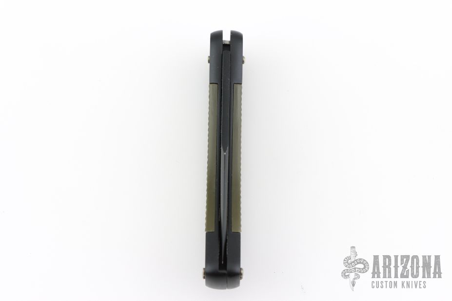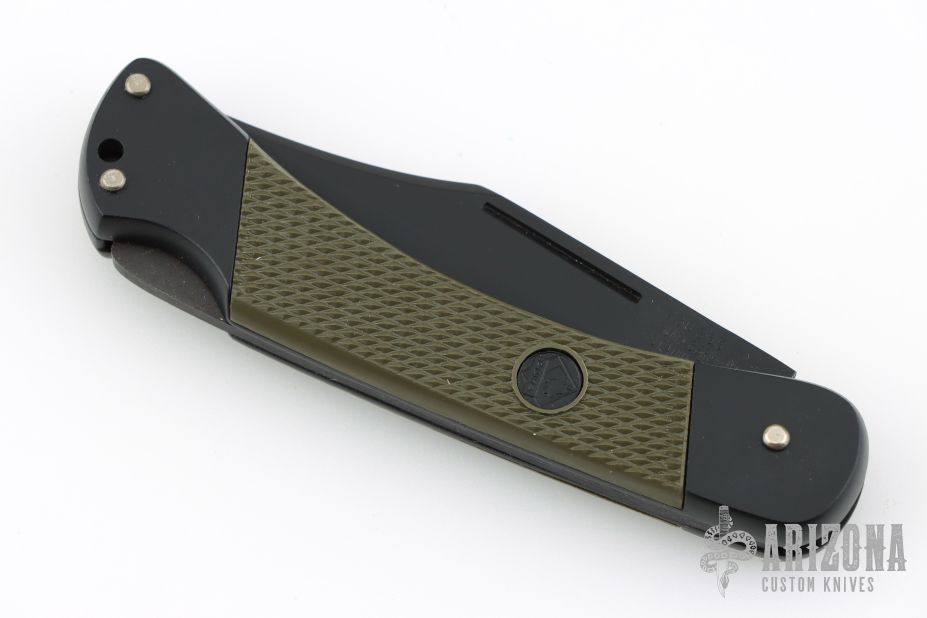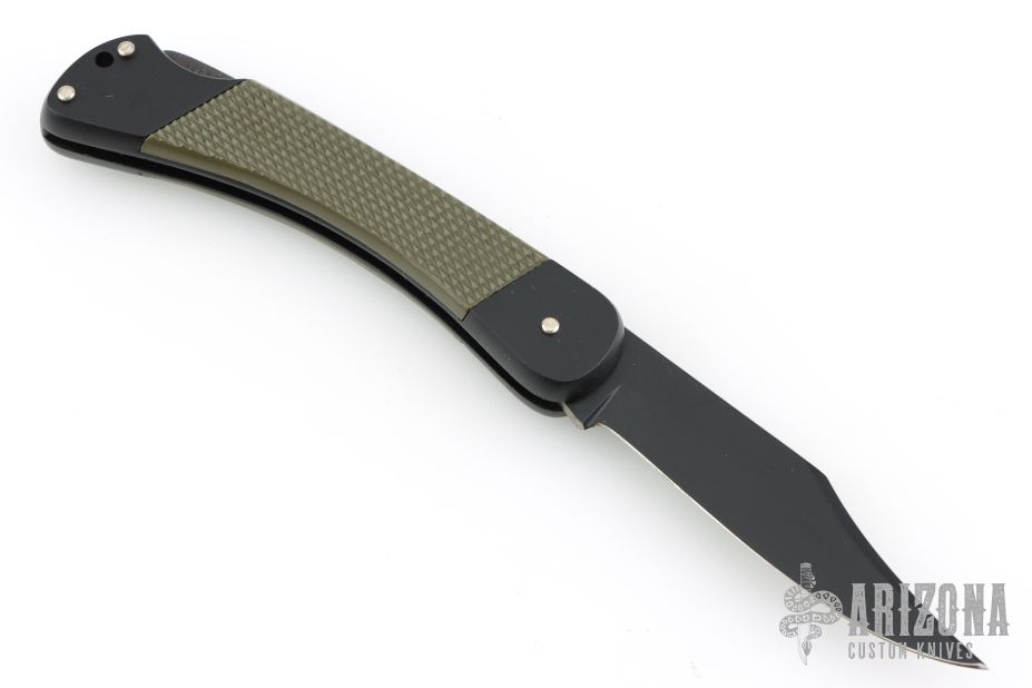 This Commando by Puma Knives features a black finished clip point blade with nail nick. It has a black aluminum frame with green insets. #41582. Excellent condition.