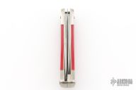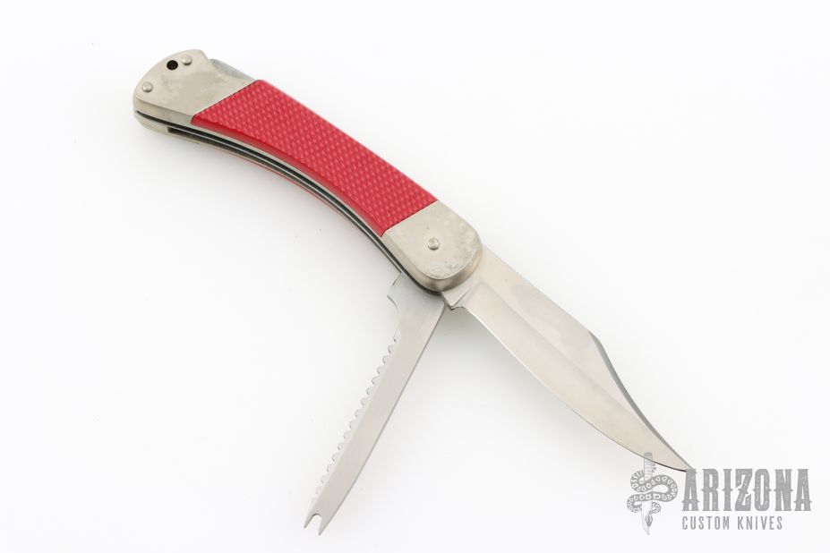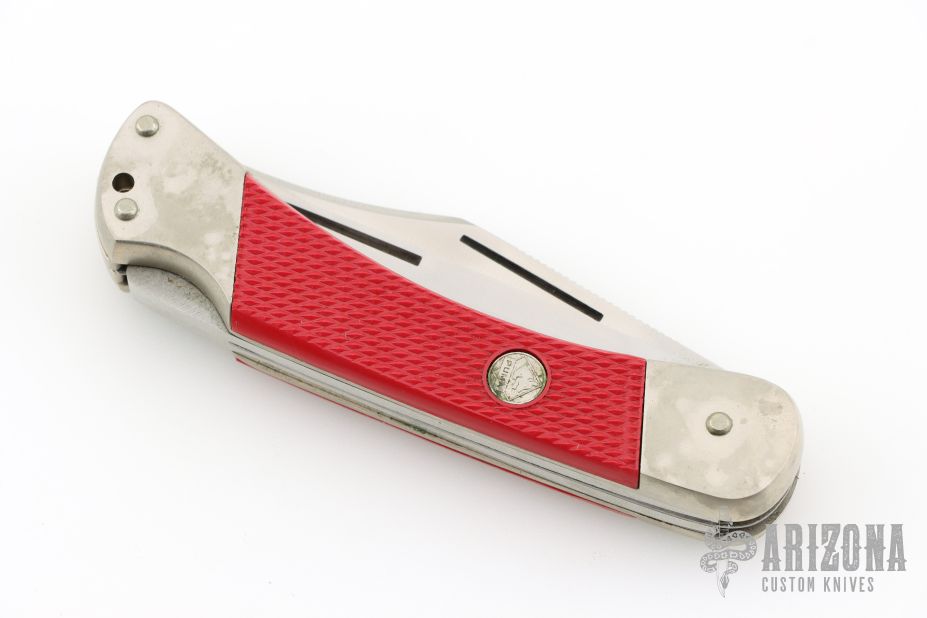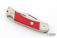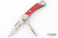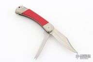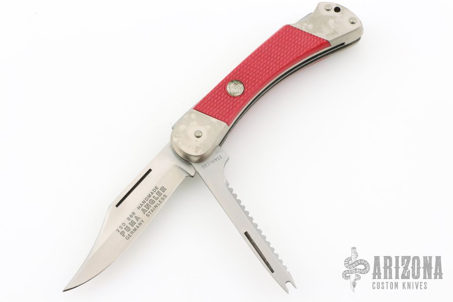 This Angler by Puma Knives features a satin finished clip point blade with partially serrated top edge and nail nick, the other blade with a scaler with nail nick. It has a nickel silver frame with red insets, lanyard hole at the butt. #22881. Has some patina, otherwise excellent condition.