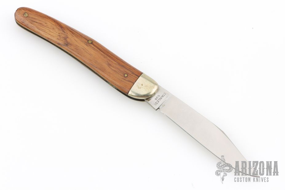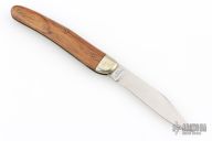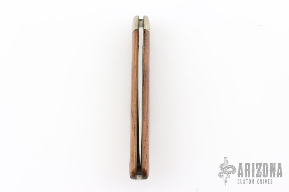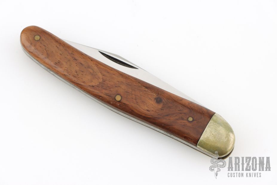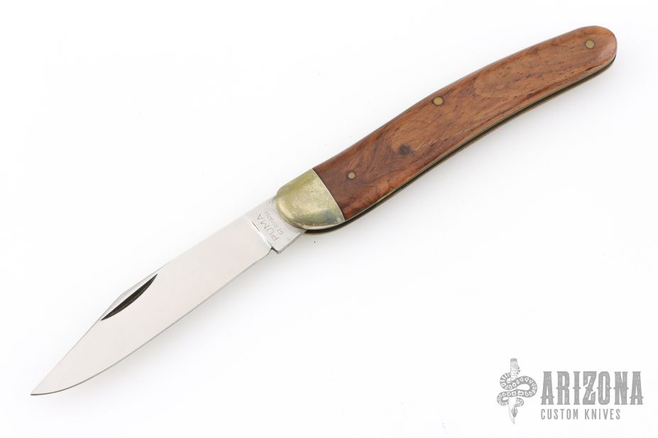 This slipjoint by Puma has a satin finished blade with nail nick. The handle has nickel silver bolsters, wood covers with brass liners and steel spring. Has some light scratches and patina, otherwise good condition.