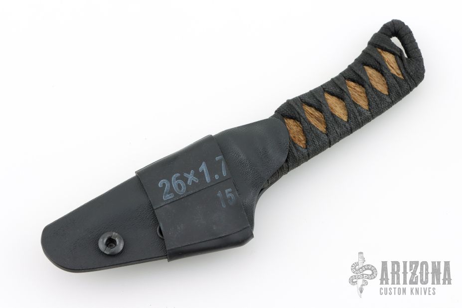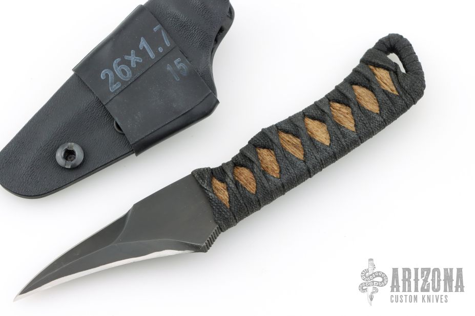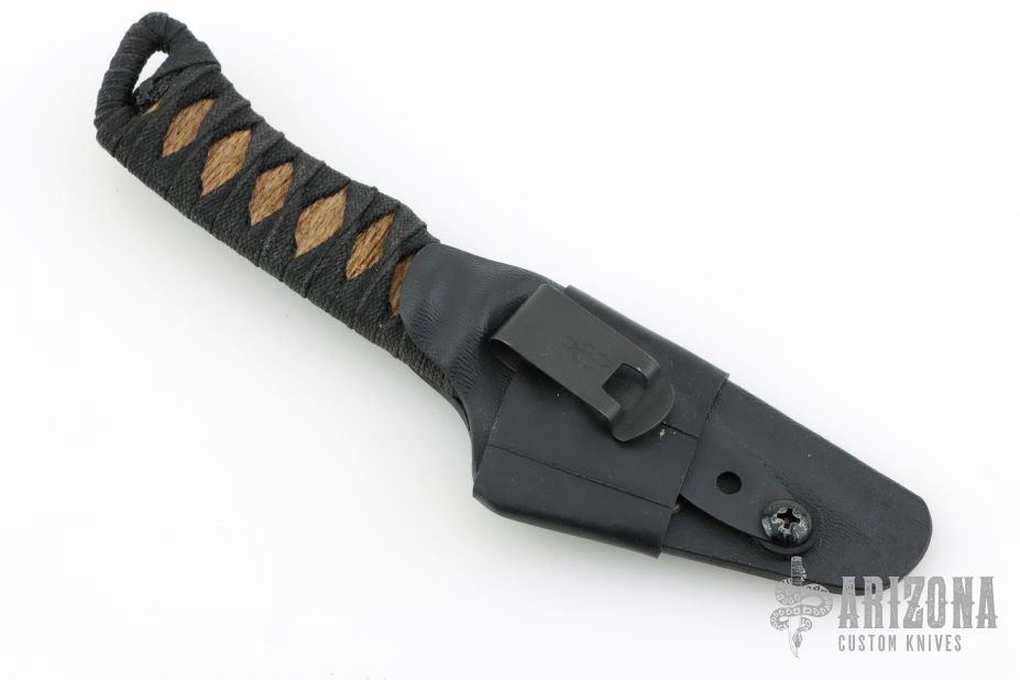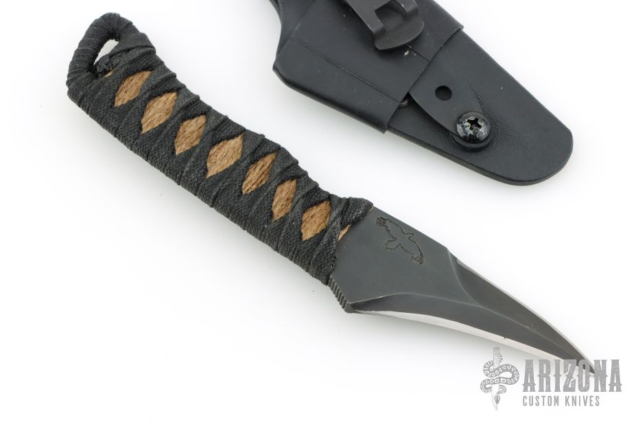 This Corax by Windy Raven Knifeworks features a black hawkbill blade with top edge, .196" blade stock and 1.252" blade depth, hidden tang construction. The handle has black cord over hemp. Comes with a kydex sheath with clip. Excellent condition.