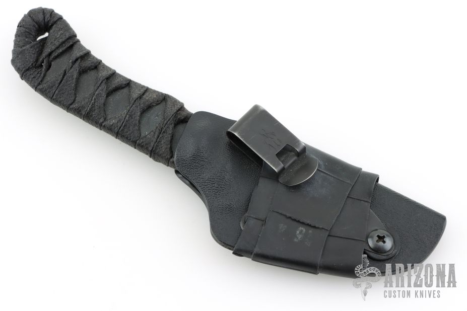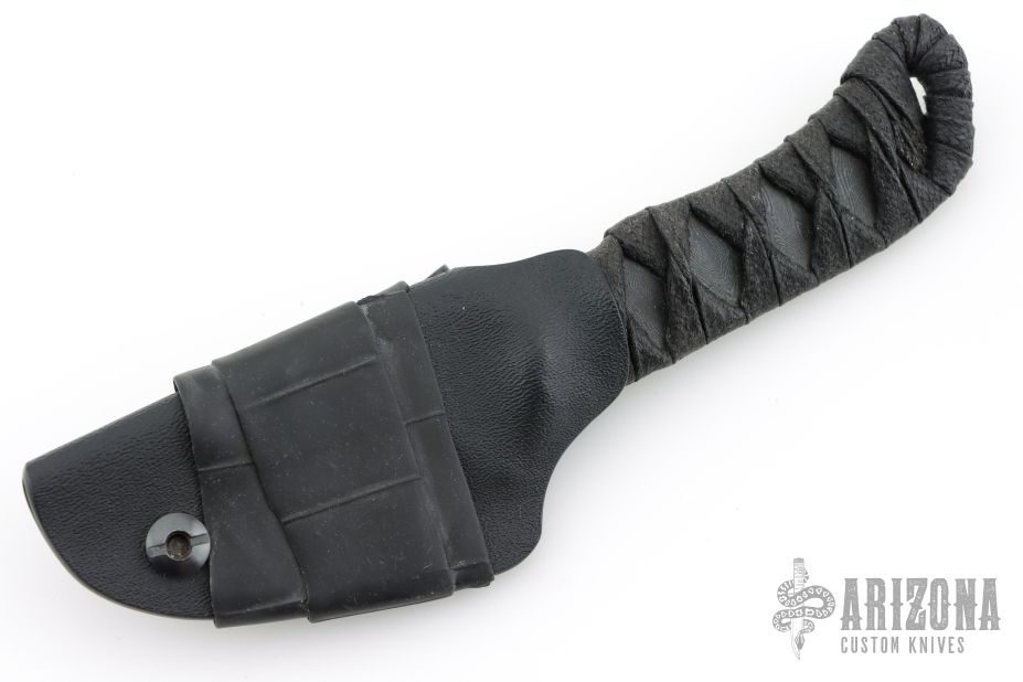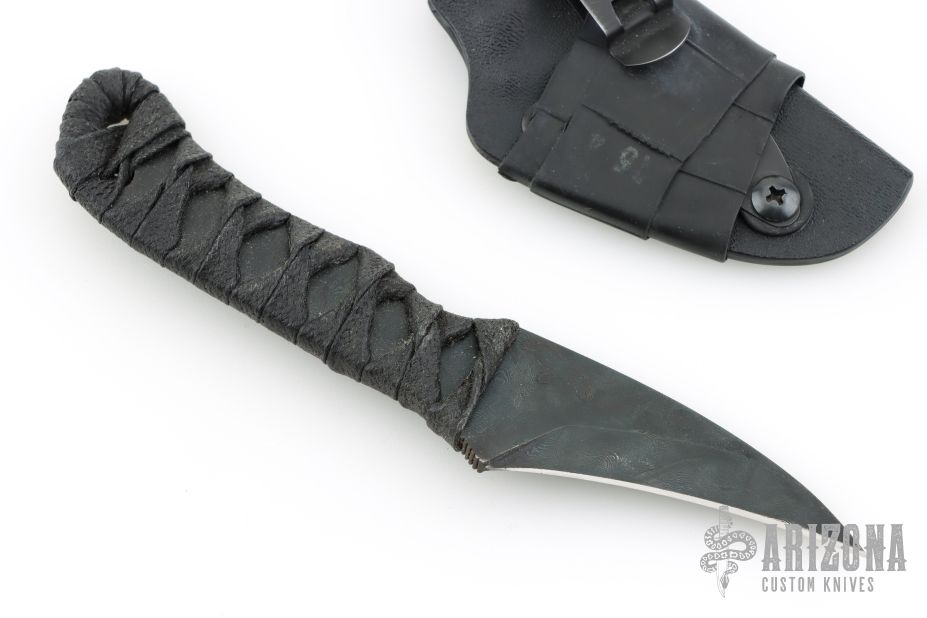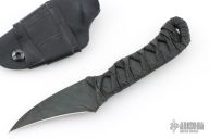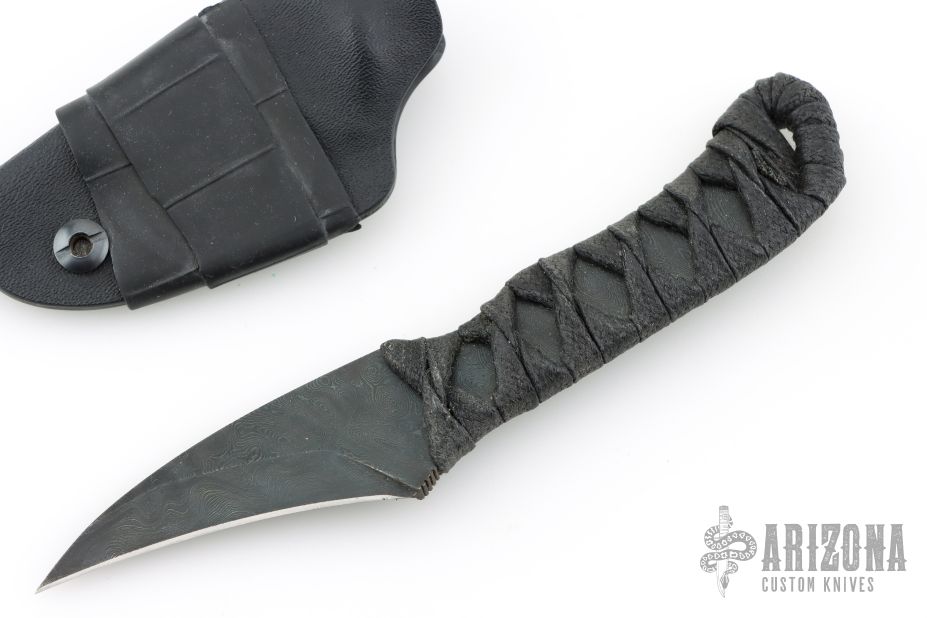 This Corax by Windy Raven Knifeworks features a darkened Damascus hawkbill blade .156" blade stock and 1.269" blade depth, hidden tang construction. The handle has black cord wrap over exposed tang. Comes with a kydex sheath with clip. Excellent condition. The consignor notes this knife was won in a Charity Auction and was Aaron Burford's personal carry knife.