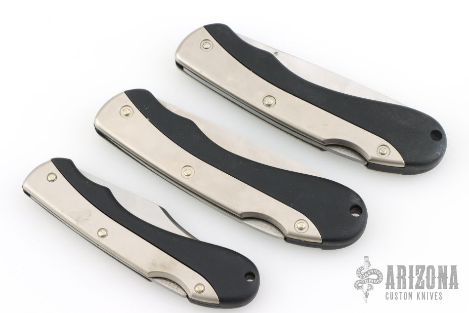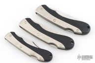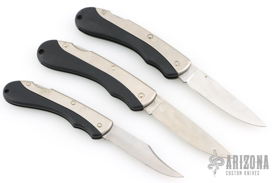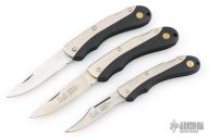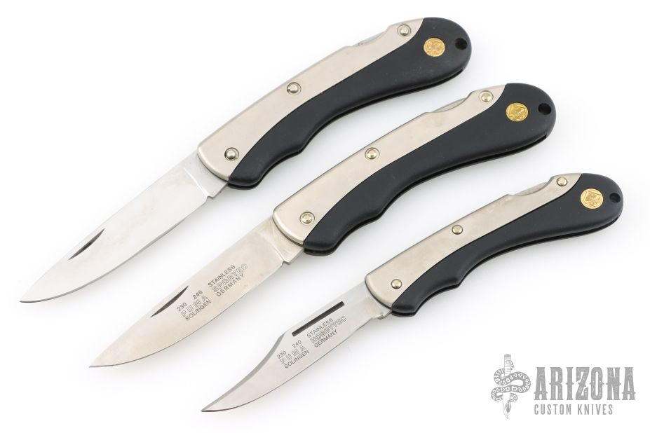 3 Puma Lockbacks - 2 are 246 Sportec and one is 240 Hobbytec. All have satin finished blades with nail nicks. The handles have aluminum and black zytel, stainless steel backspacers. Has some scratches, otherwise good condition. The Sportecs have 3.25" blades and 7.625" overall. The Hobbytec has 2.75" blade and 6.75" overall.