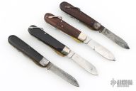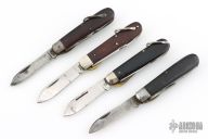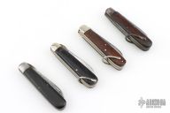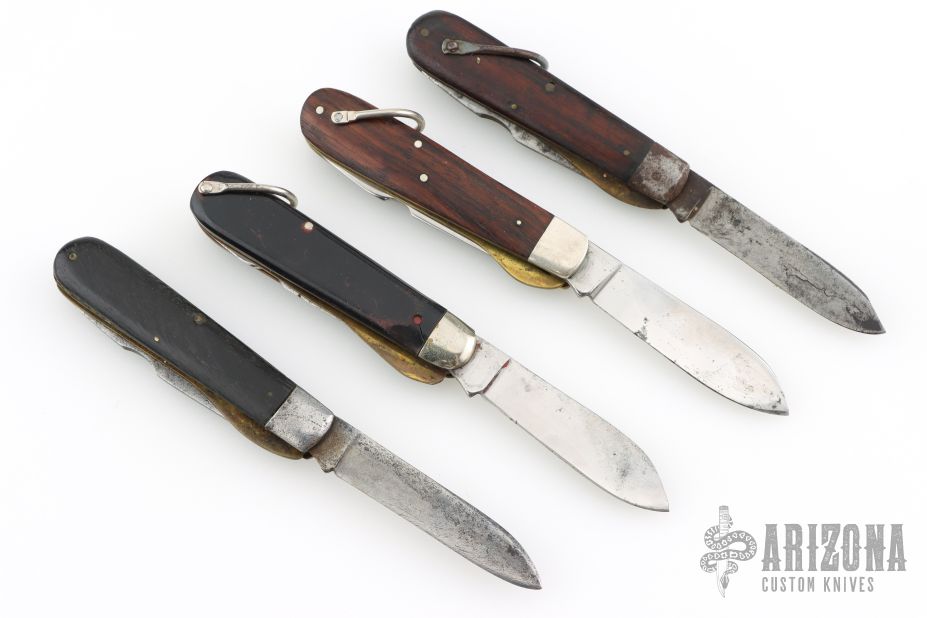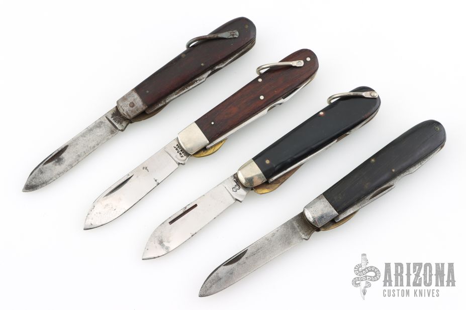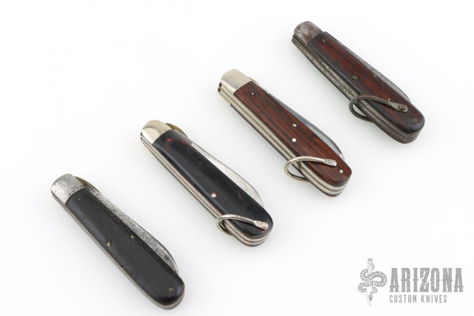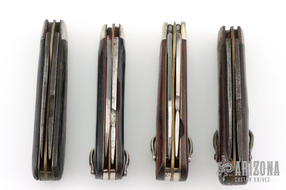 3 - Ka-Bar - Mirror polished blades, nickel silver bolsters, wood scales, brass liners and steel springs. Lanyard bail. Has pitting, a little oxidation, has some scratches, otherwise good condition.