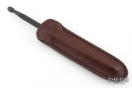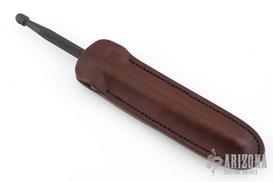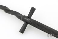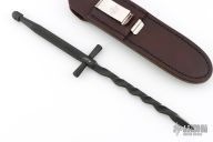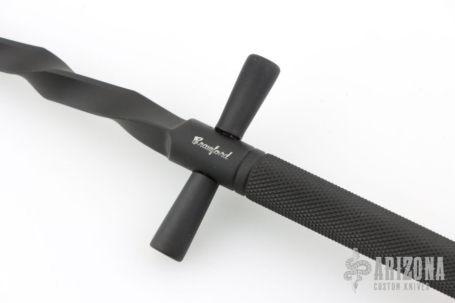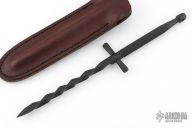 This Twisted Spanish Dagger from Crawford Knives is an all steel 440C sleeve knife. It is designed and refined after seeing the OSS sleeve dagger from World War II. The blade is twisted and triangle shaped for strength and easy penetration. The handle is knurled for a sure grip and has posts for a guard. Tungsten DLC coated. Includes a leather sheath with metal clip. Excellent condition.