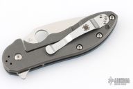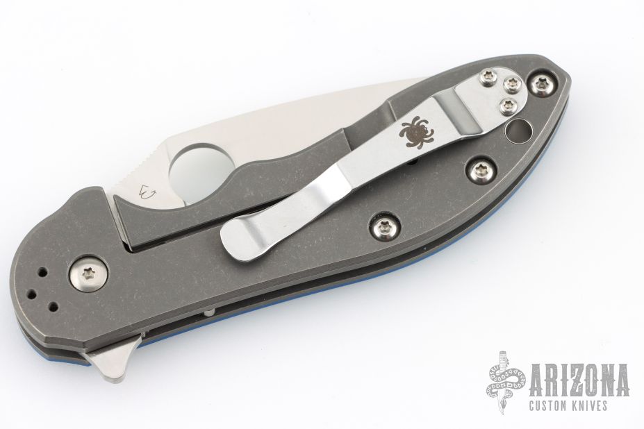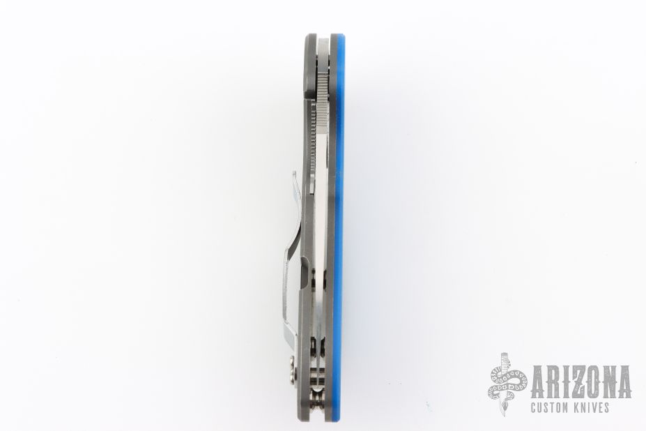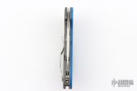This Domino Flipper has a satin finished stainless steel drop/spear point blade with thumbhole and notched thumbrest. Handle is stonewashed titanium with A-side blue G-10 overlay, 4-way anodize finish reversible deep carry clip, and lanyard tube pin. Action is extremely responsive with great lockup. Comes with original box. Excellent condition.