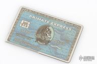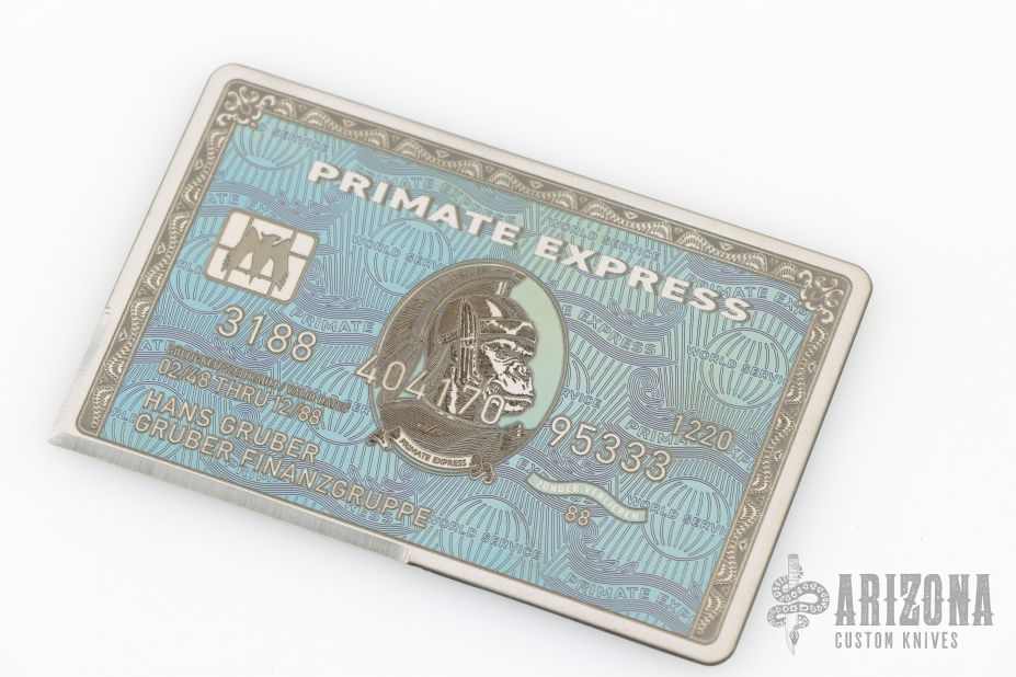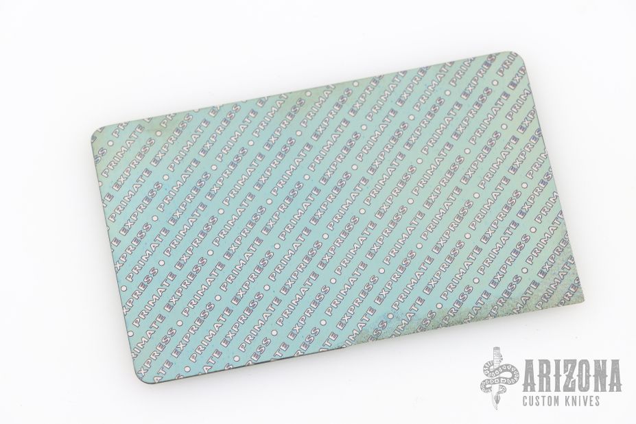 Primate Express Titanium Card Blade by Mummert Knives. Has Fiber Laser Color and Deep Etch. Tungsten carbide edge, RC 72. Excellent condition with original bag.