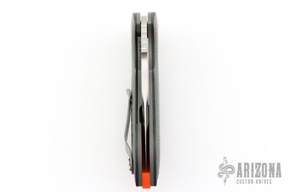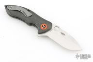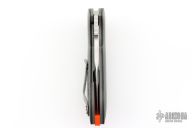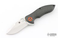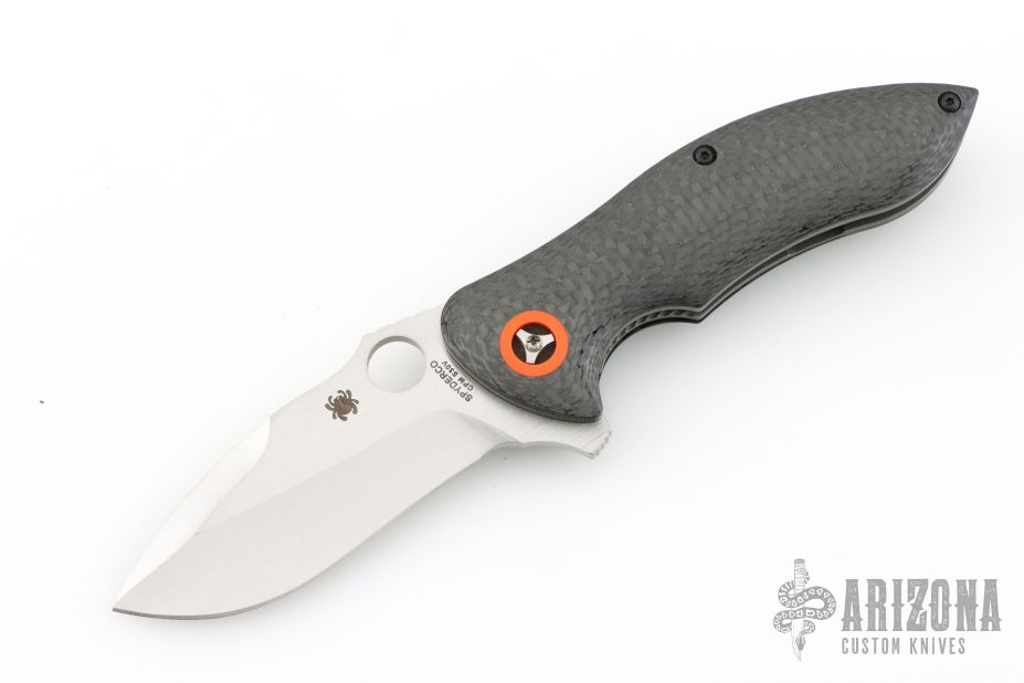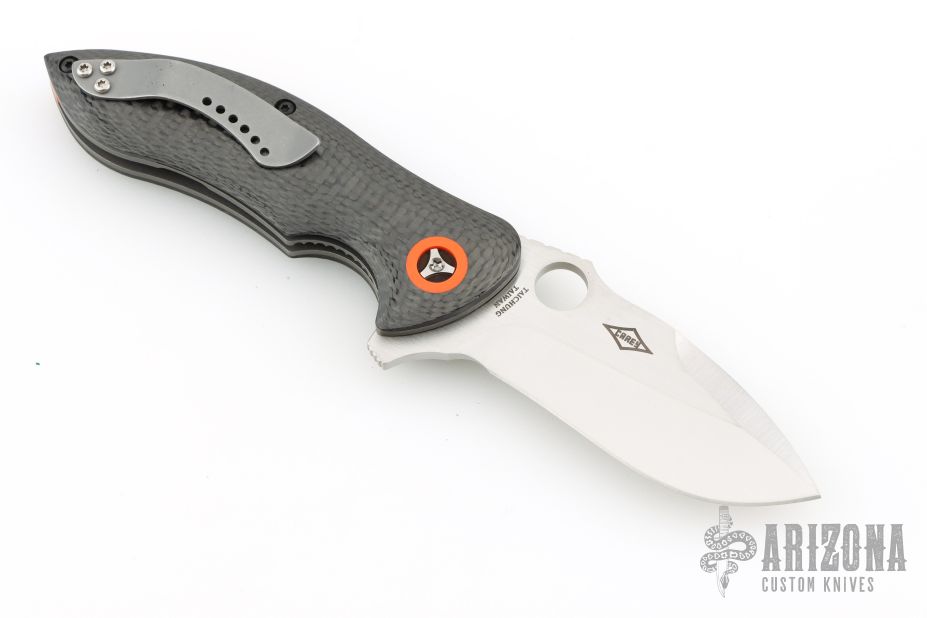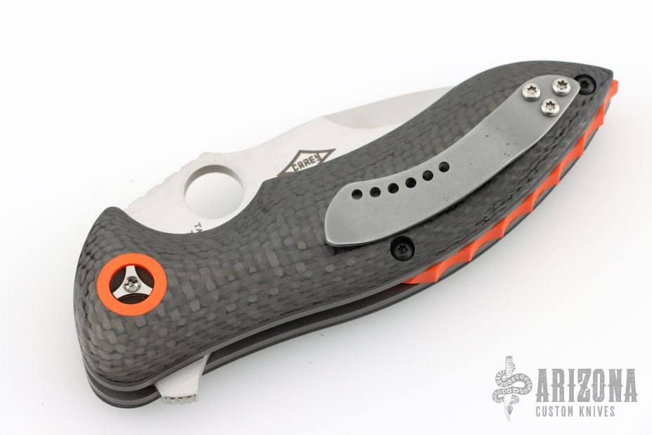This Rubicon is a Peter Carey design by Spyderco, it features a satin finished spear point blade with thumbhole, notched thumbrest and flipper. The handle has carbon fiber scales with orange G-10 pivot surround and backspacer, tumbled titanium liners and a tip up stainless steel clip. Nice detent, lockup and blade seating. Comes with original zippered case. Has a couple light scratches, and a few marks on the clip. Excellent condition otherwise.