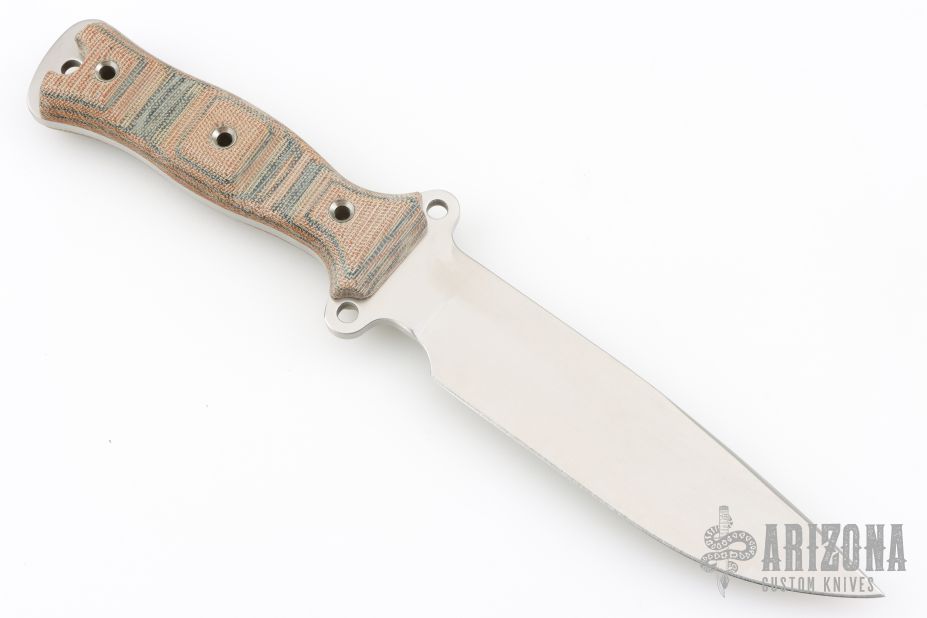 This Nano Gemini by Busse Combat Knife Company features a drop point satin finished blade with .175" blade stock and 1.467" blade depth. The handle has Tigerhide canvas micarta scales over full tang construction. Exposed tang pommel with lanyard hole. Excellent condition.
