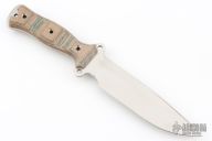 This Nano Gemini by Busse Combat Knife Company features a drop point satin finished blade with .175" blade stock and 1.467" blade depth. The handle has Tigerhide canvas micarta scales over full tang construction. Exposed tang pommel with lanyard hole. Excellent condition.