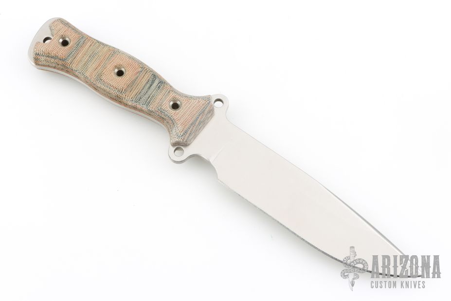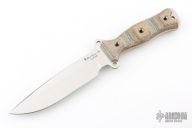 This Nano Gemini by Busse Combat Knife Company features a drop point satin finished blade with .175" blade stock and 1.467" blade depth. The handle has Tigerhide canvas micarta scales over full tang construction. Exposed tang pommel with lanyard hole. Excellent condition.