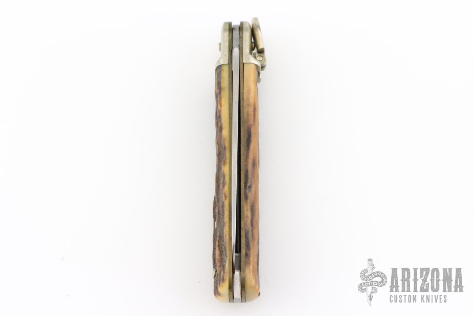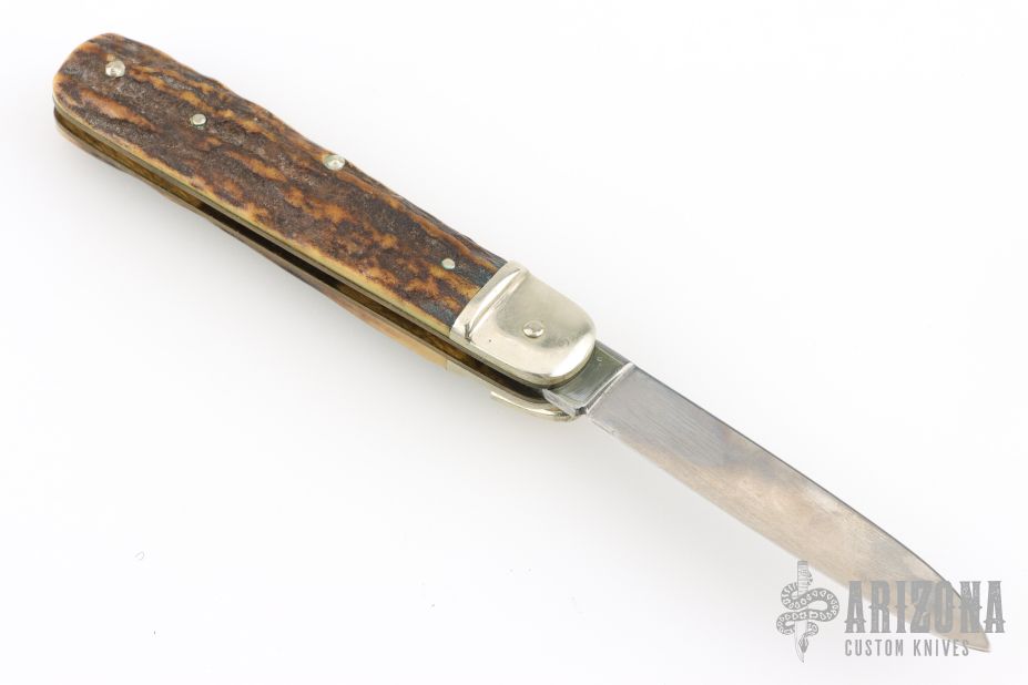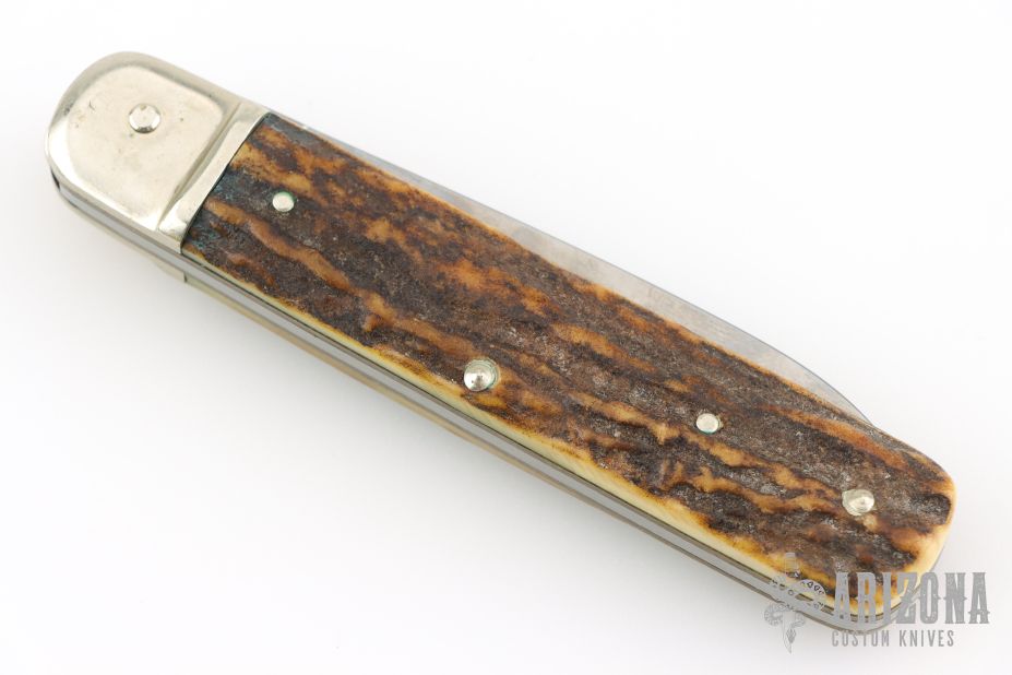 This lever lock auto by Boker features a drop point blade, nickel silver bolsters, stag scales, brass liners and stainless steel backspacer. Has a couple light scratches, otherwise excellent condition.