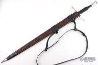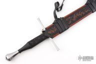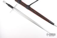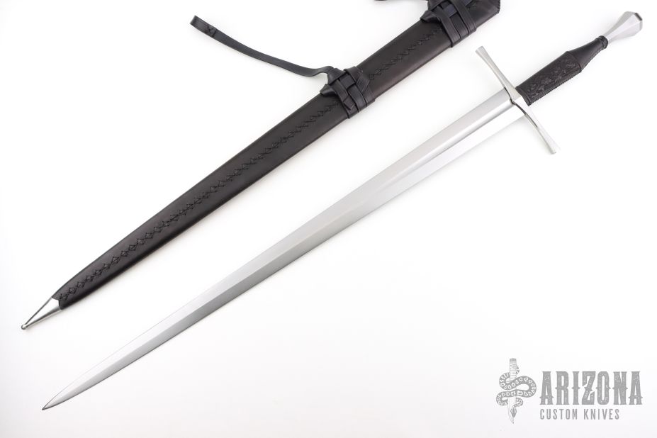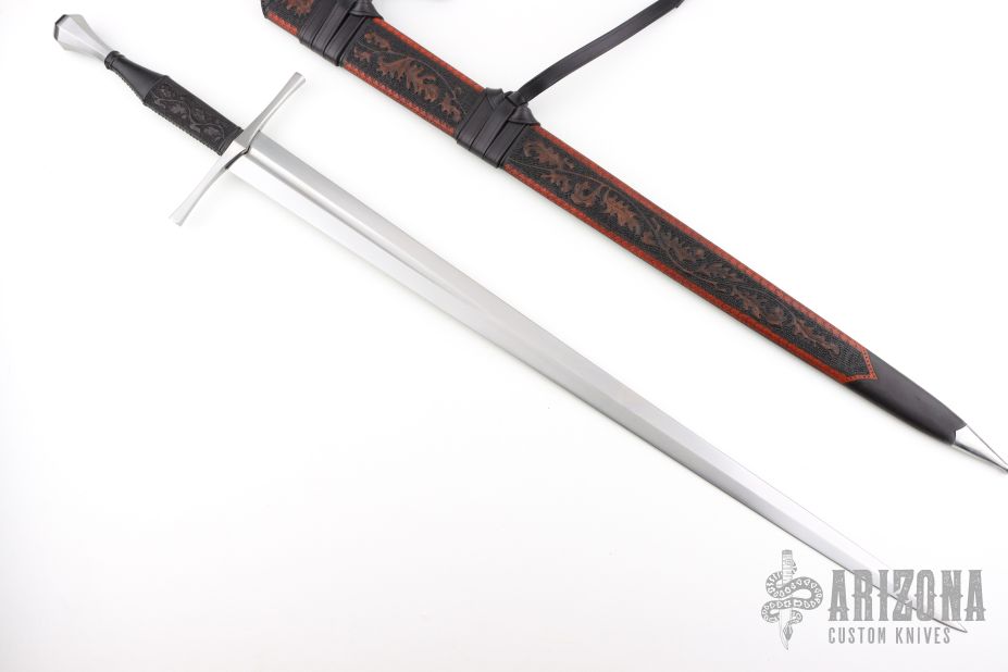 This Bastard Sword by Sulowski Swords features a hand rub satin finished blade with fuller, sharp edges, hidden tang construction with .227" blade thickness and 2.163" blade depth. The handle has a hand rub satin finished hilt that is 8" wide, with a leather covered grip and octoganal pommel. Comes in an impressive hand-tooled leather scabbard with leather strap. Excellent condition.