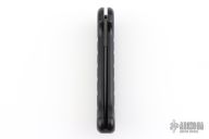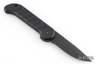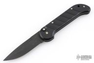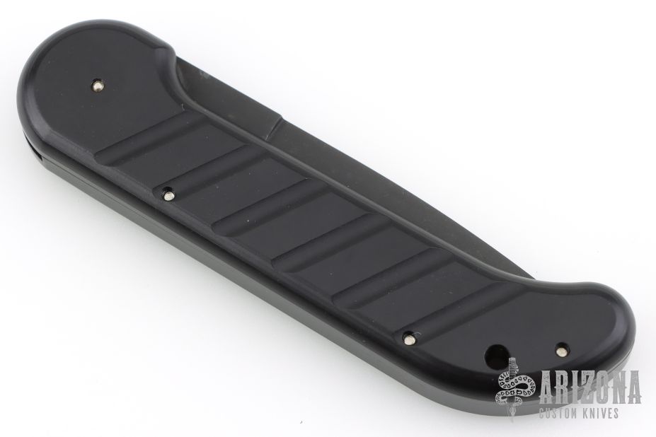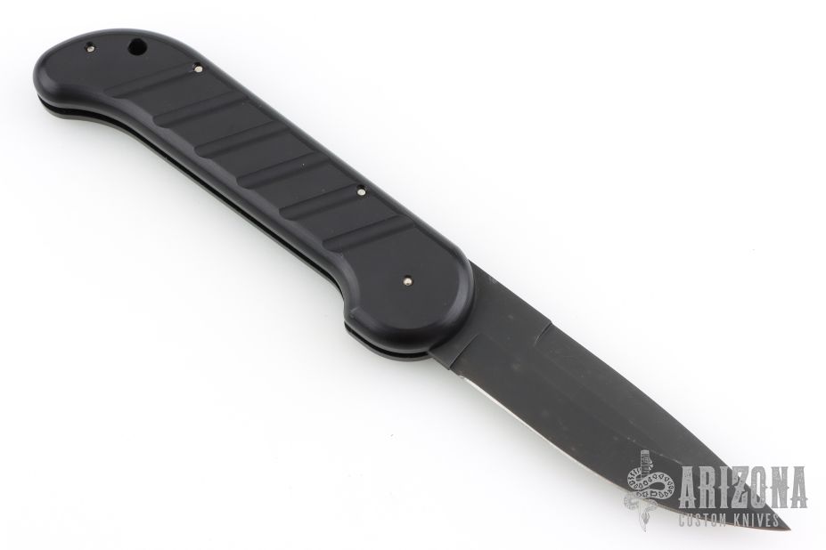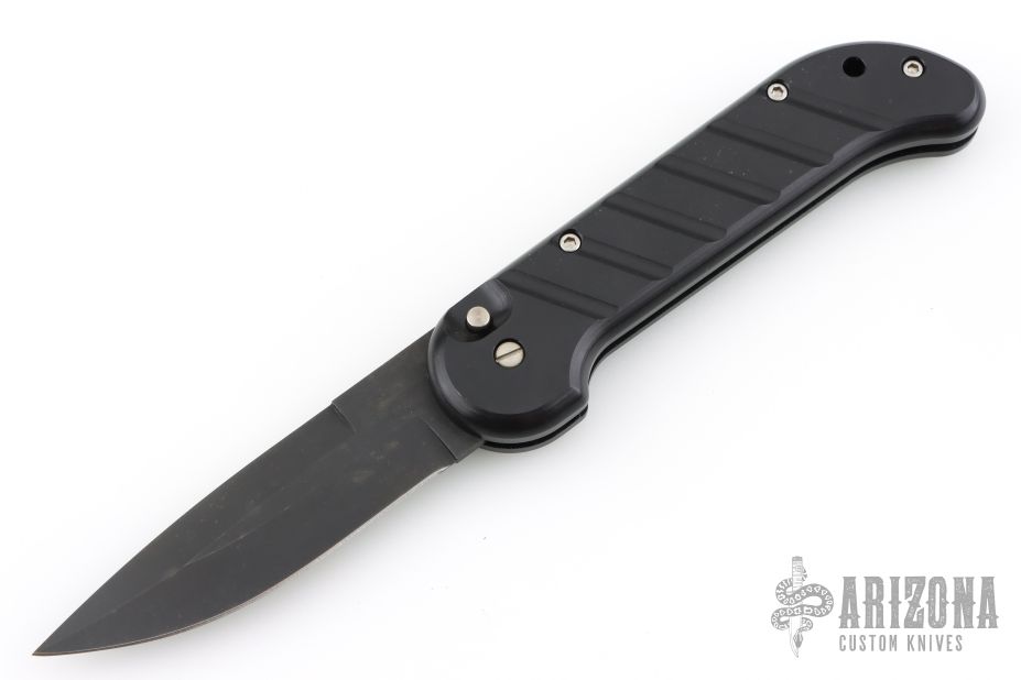 This Ron Miller/Charles Ochs coil-spring automatic features a black blade and black anodized aluminum frame. Strong and fast opening. Nice function. Has some light scuffs, excellent condition otherwise.