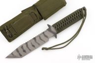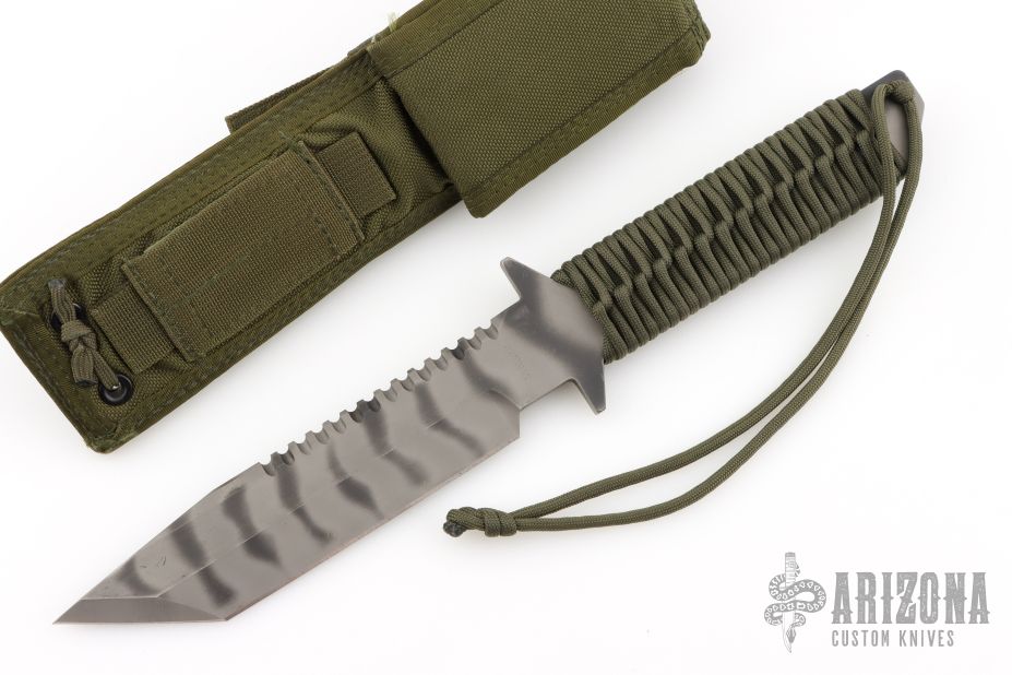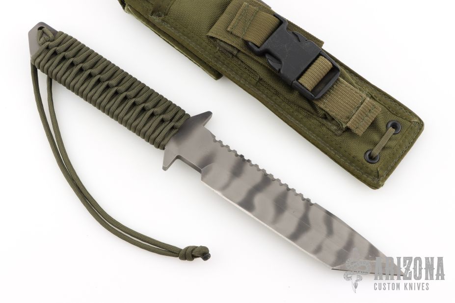 This D9 by Strider features a tiger striped blade with sharpened top edge and notched thumbrest, .244" blade stock and 1.481" blade depth, Integrated double guard with paracord warp. Comes with nylon tactical sheath. Has some scuffs and scratches, great condition otherwise.