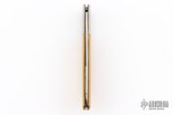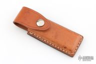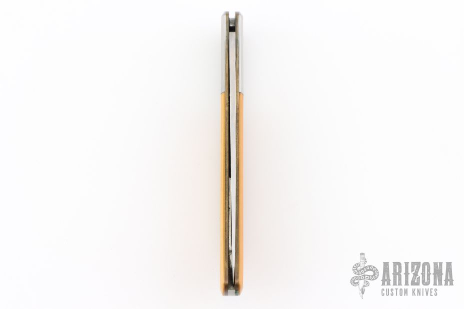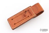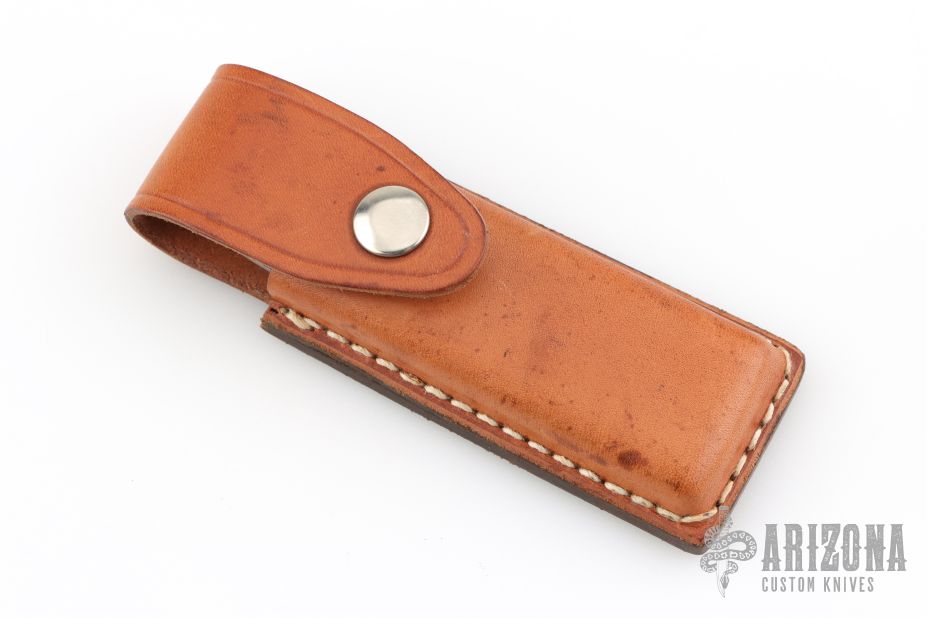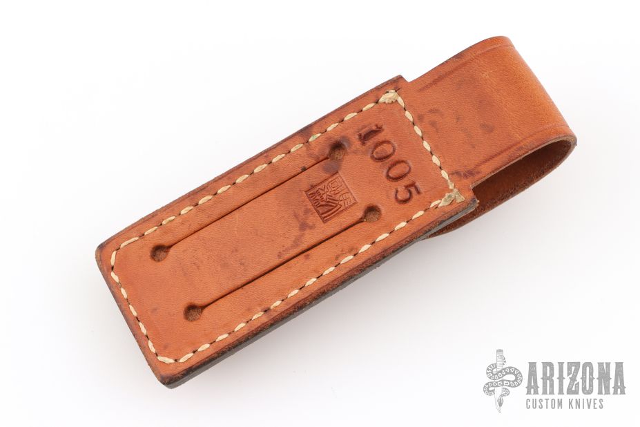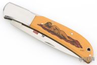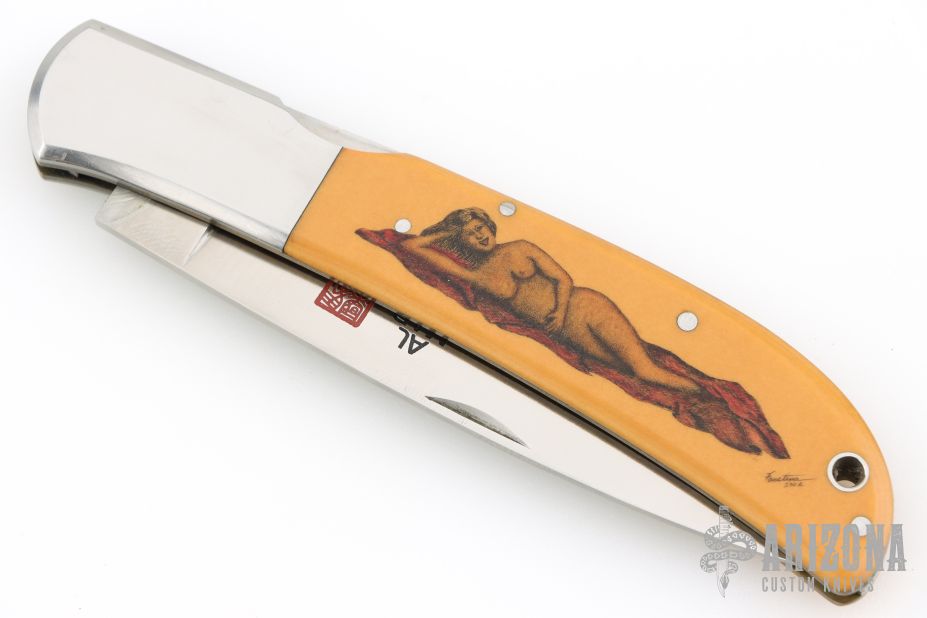 This Eagle by Al Mar features a satin finished blade with nail nick. The handle has stainless steel bolsters, yellow paper micarta scales, brass liners, stainless steel backspacer. Has some light scratches, otherwise excellent condition. Comes with original leather sheath. The scale has been scrimshawed with a nude lady by Faustina and dated 2002.