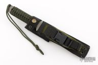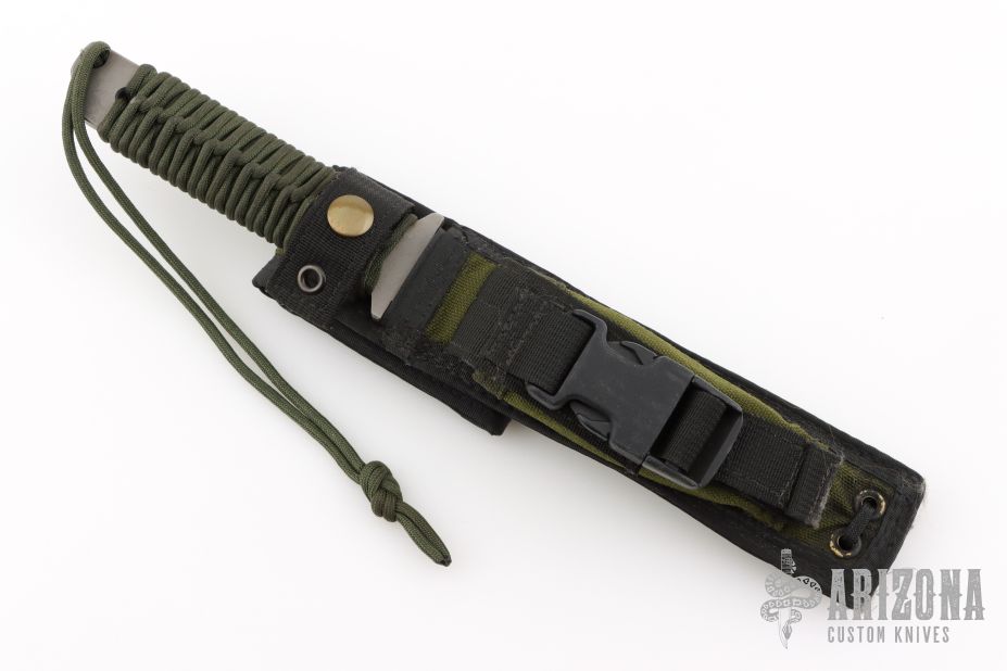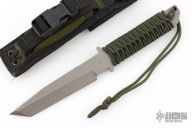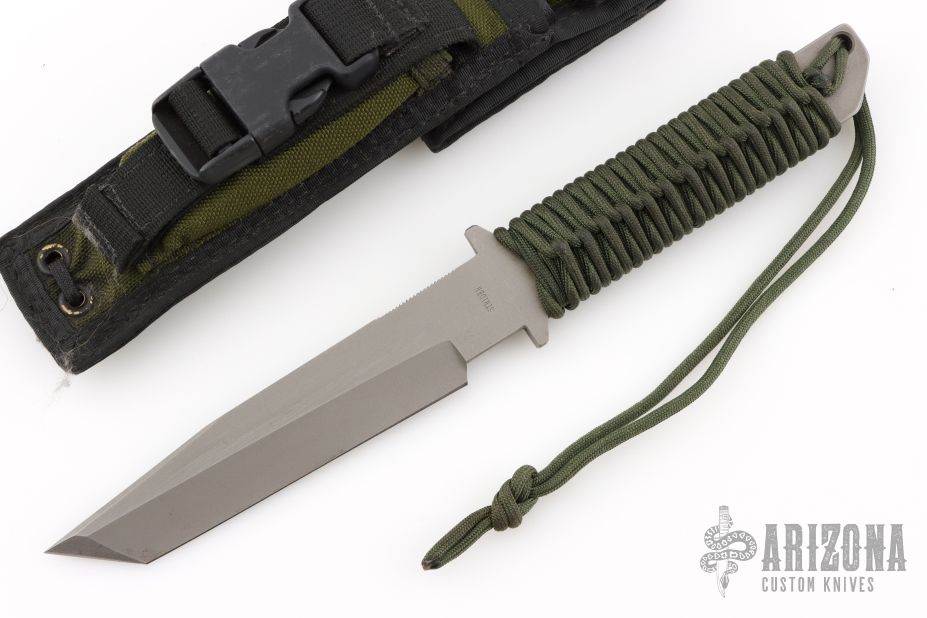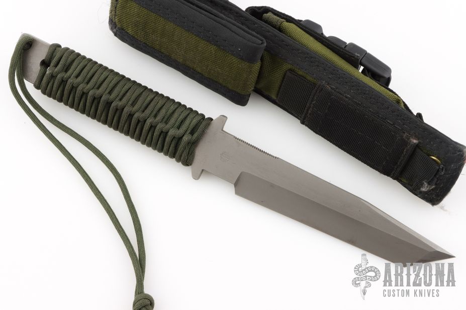 This tanto from Strider features a bead blasted tanto blade with false top edge, .247" blade stock and 1.266" blade depth, full tang construction, green paracord wrap. Includes nylon sheath with belt loop and Strider Velcro pouch. Has some scratches, great overall condition.